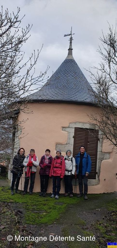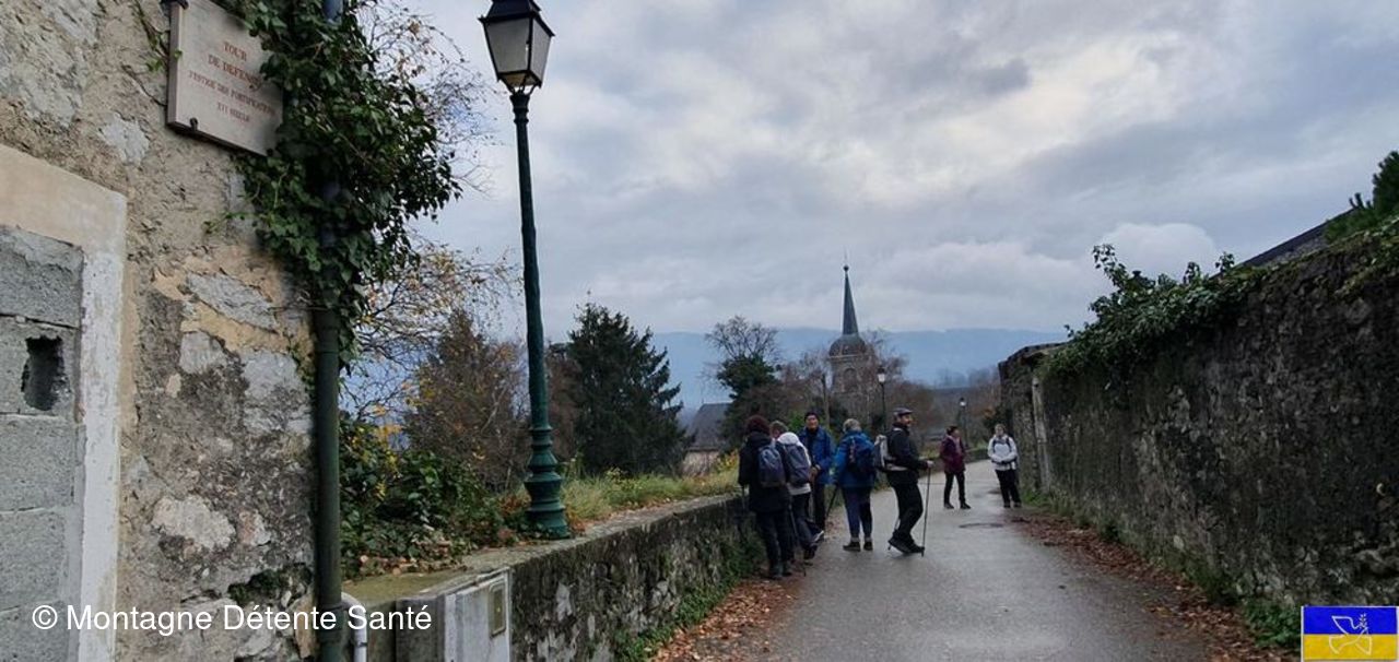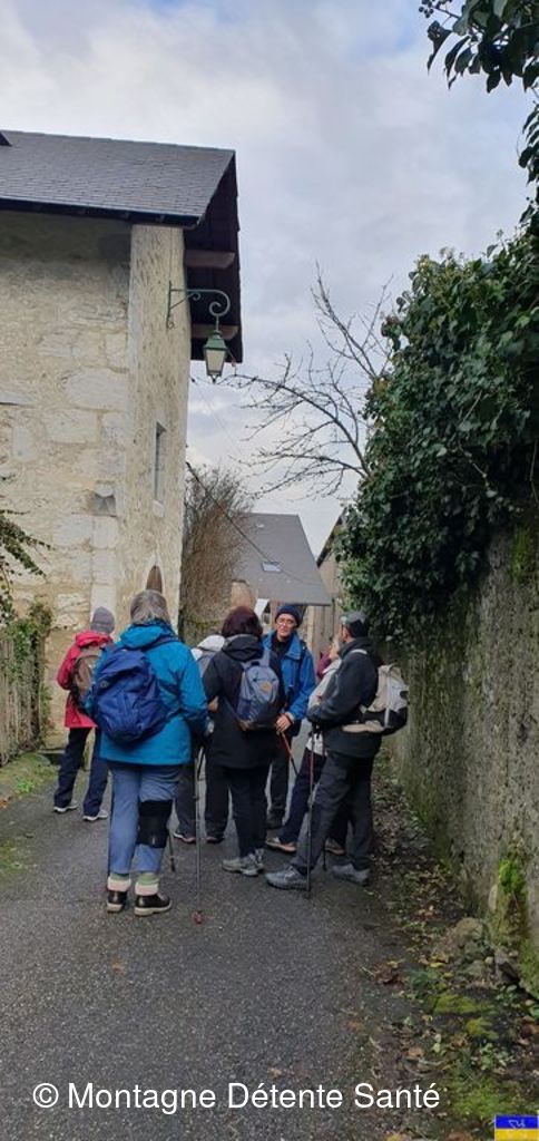 Bien qu'annoncé, le beau temps de la mi- journée a eu du mal à se montrer ... 4 inscrits se sont décommandés au dernier moment. Départ du parking de la piscine de Montmélian, direction l'auditorium puis le Fort. Claude nous a accompagné et nous a apporté ses connaissances de l'histoire de la ville au fur et à mesure de notre progression. Nous avons revisité la Montmélian que nous connaissons bien, pour la plupart d'entre nous et découvert ses 3 églises, les constructions sur les tours des remparts, la prison impériale, les différentes voies empruntées jadis pour le commerce, la rue de la chaîne et les ponts qui permettaient de franchir l'Isère (nous avons traversé le pont Morens) ...