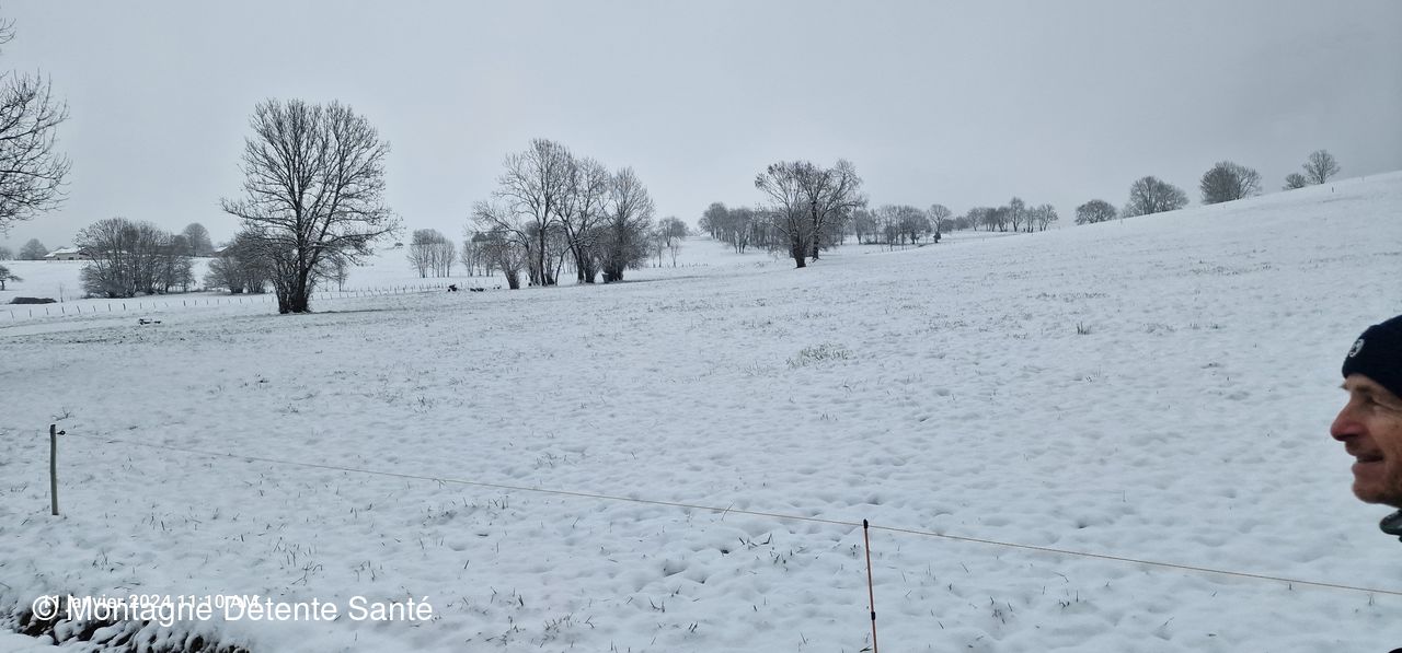 Traversée sur la passerelle enneigée, puis nous remontons par un sentier assez raide et glissant pour atteindre le plateau et suivons une petite route jusqu'au lieu-dit "le Chene". Un lavoir reconverti en aquarium nous accueille avec ses magnifiques carpes koi.