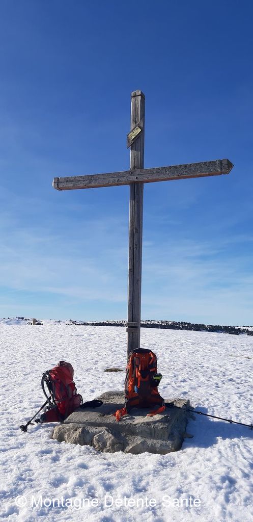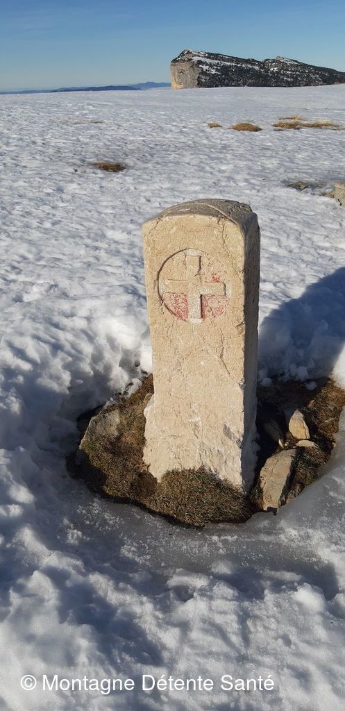 Depuis le col petit détour pour observer l’ancienne borne 27 puis une dernière grimpette jusqu’à la croix où nous ne nous sommes pas attardés car le vent était très vivifiant. Nous sommes partis rechercher un coin un peu plus abrité pour le pique-nique.