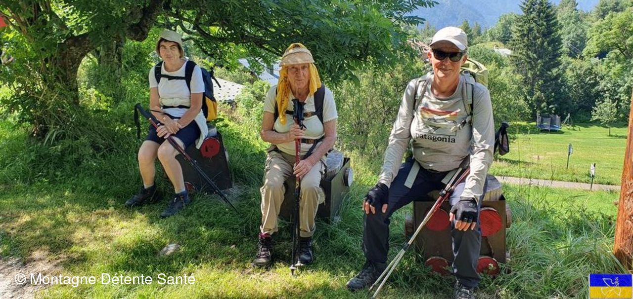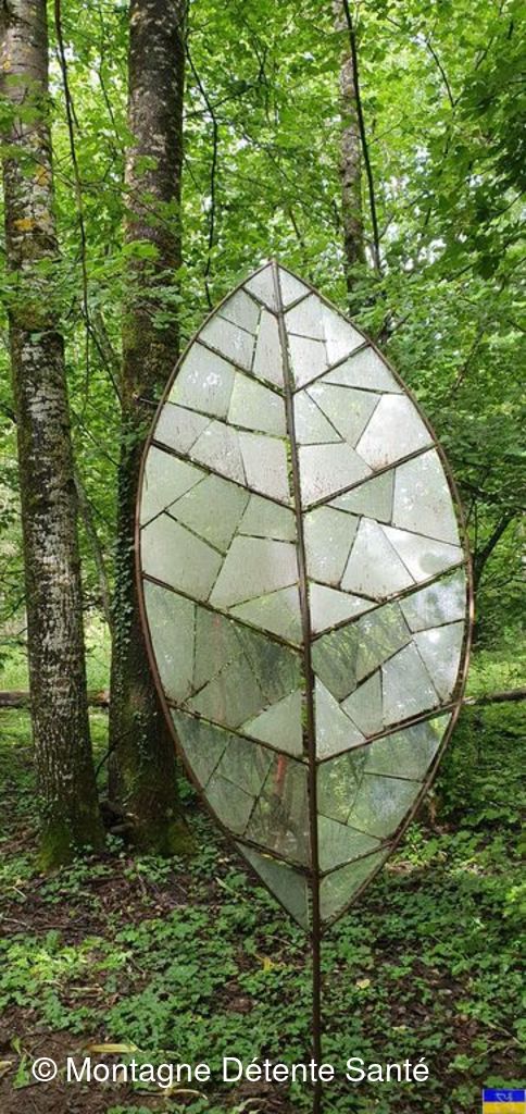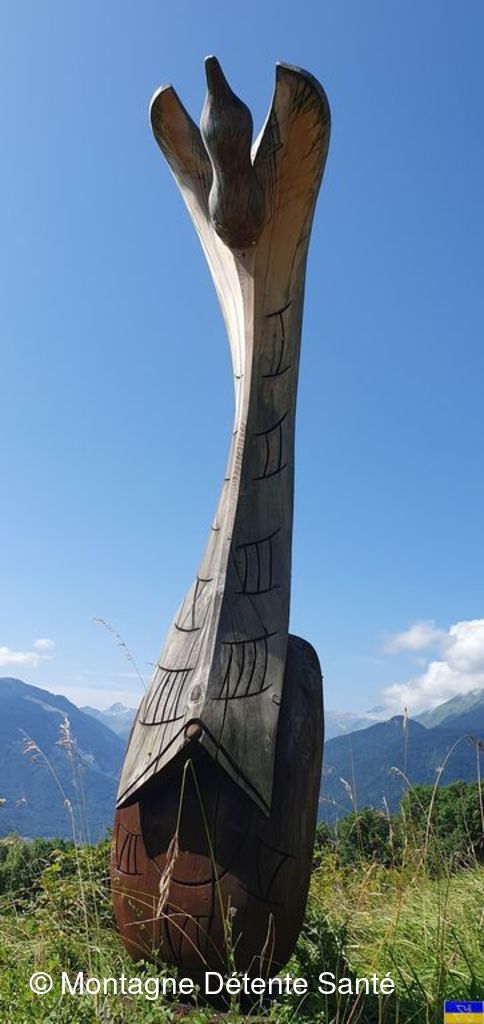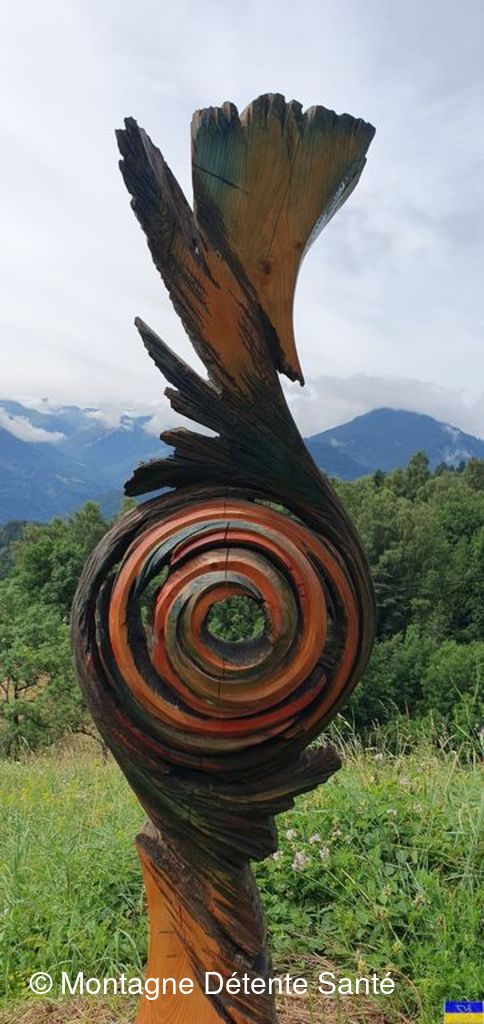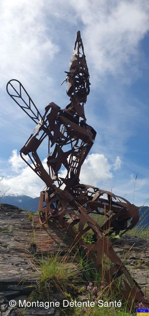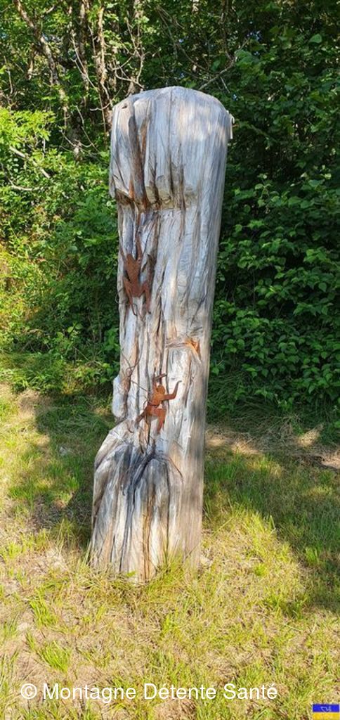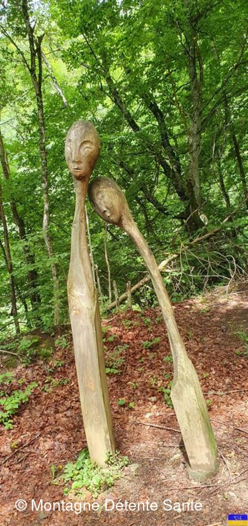 Partis du plan d'eau de la Trappe, vers 9h30, nous avons regagné la forêt, puis des espaces plus dégagés avec vue sur de superbes sommets au dessus de Moutiers et plus loin sur l'Italie (Massif du Ruitord), la Vanoise, la vallée des Bellevilles, ...) Tout au long du parcours, nous nous sommes laissés surprendre par un grand nombre d'oeuvres artistiques, principalement réalisées à partir de matériaux naturels par des artistes internationaux. Depuis une vingtaine d'année le site s'enrichit d'oeuvres nouvelles, en paille, en bois, en pierre, en métal sur différents thèmes (la rencontre, le feu, le jeu, ...) et en perd d'autres qui disparaissent dans la nature ... leurs noms, "la Fée Myrtille", "Demain", "Boudh'arbre", "Rencontres", " le chat Cheshire", "Solidaires", .... nous font rêver, réfléchir, méditer ... Le parcours nous a emmené aussi à la découverte des hameaux de Hautecour, riche en patrimoine, églises, chapelles, oratoires, plan d'eau aménagé, ruisseaux, bancs sculptés pour faire une pause. Nous avons pique-niqué avec "l’accordéoniste" à la croix de la Pêche" dominant le hameau du Breuil devant un panorama magnifique. Enchantement, amitié, très belle journée pour tous !