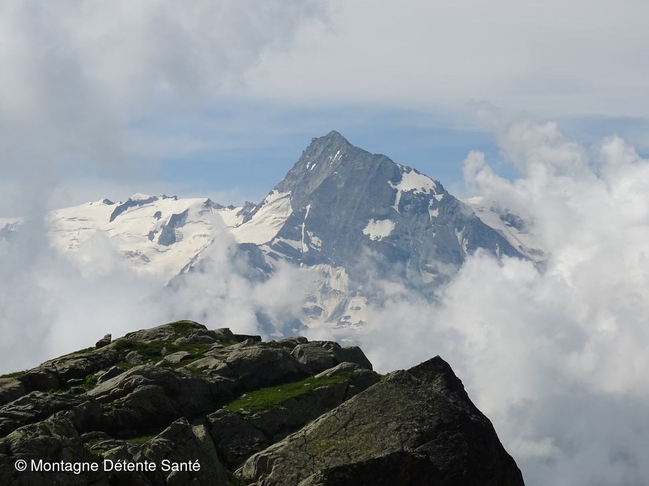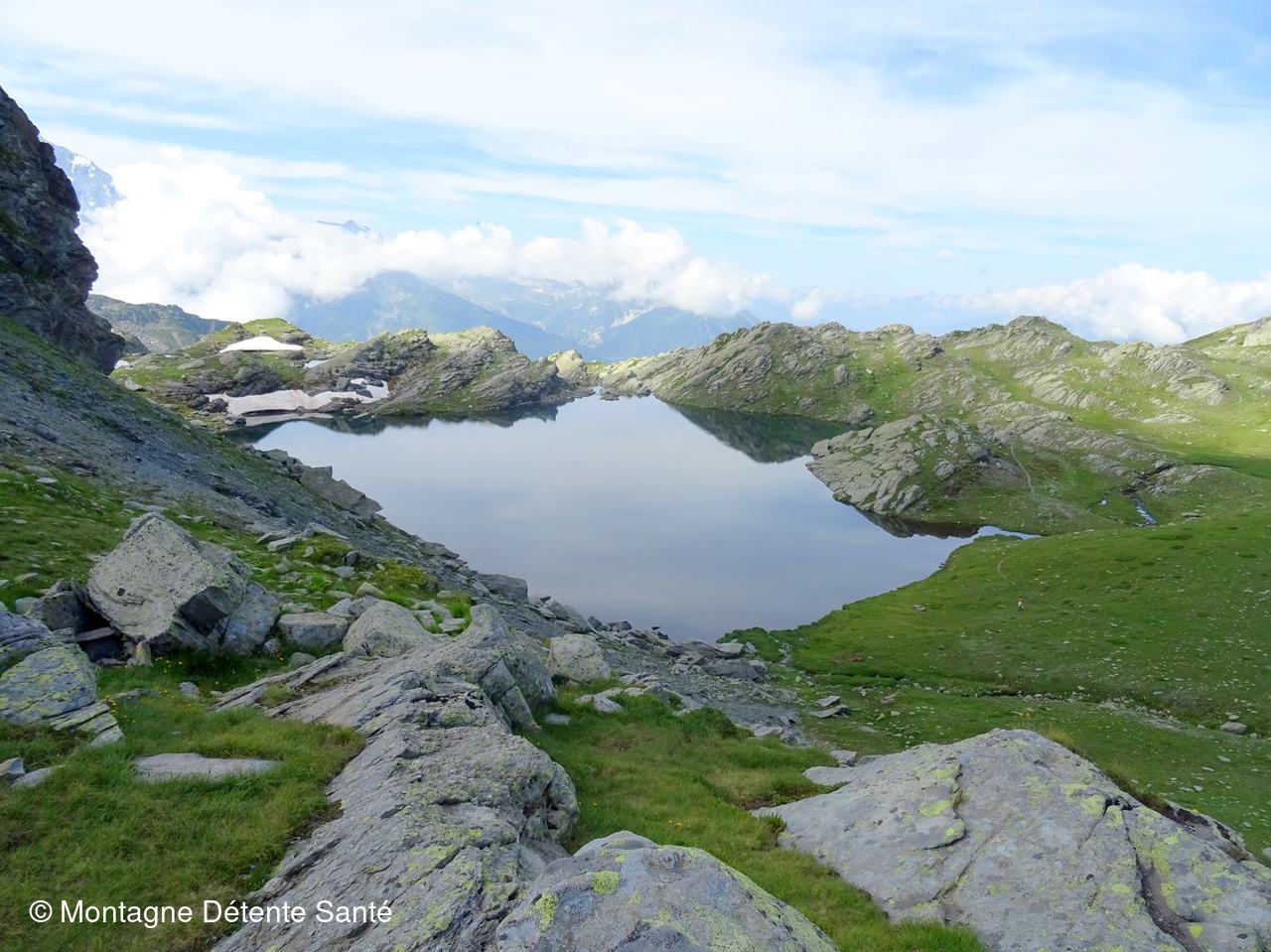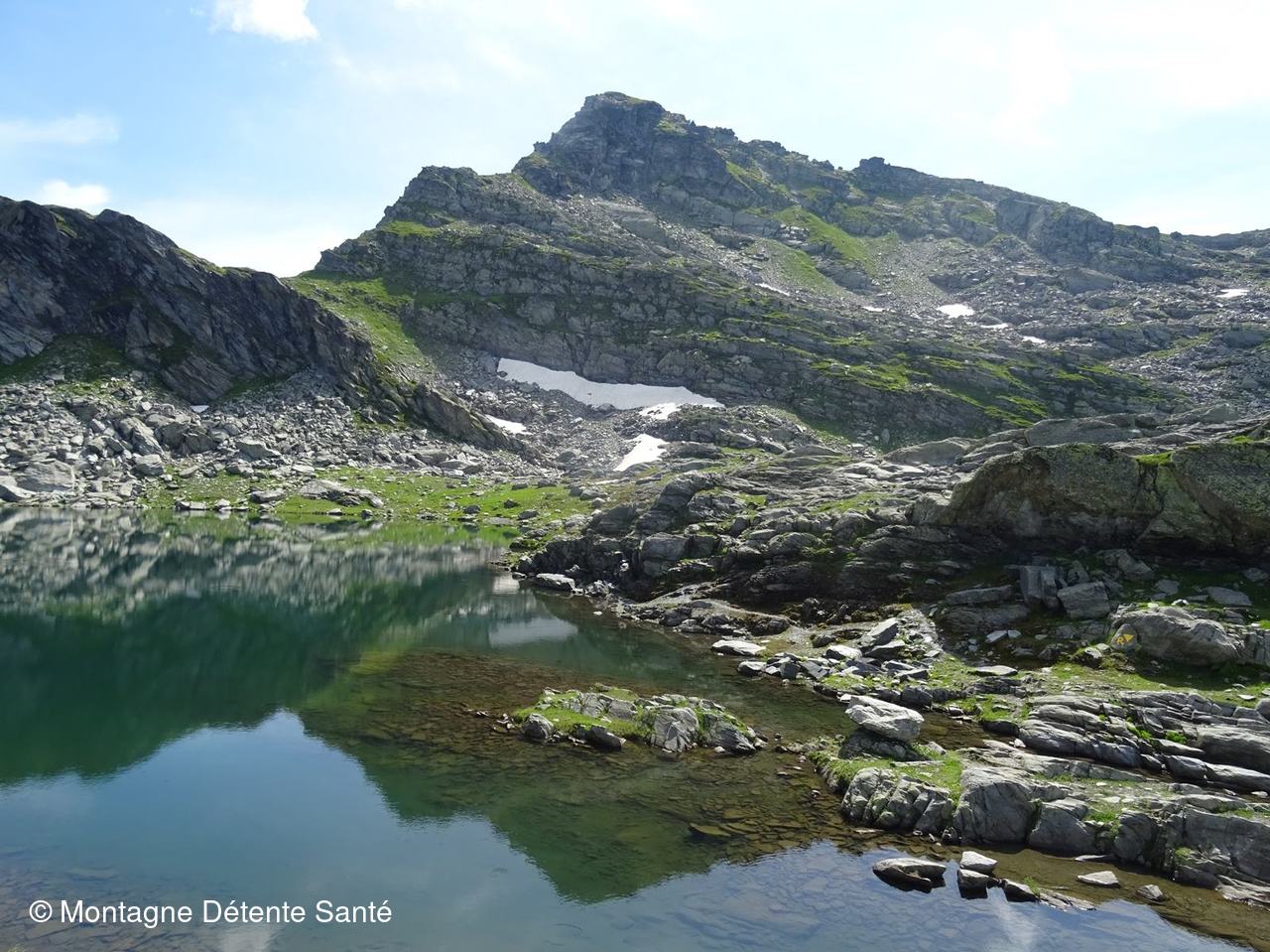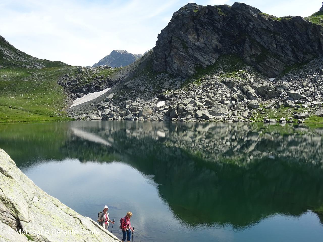 Après une petite pause bien méritée au Col du Retour, nous continuons en direction du lac, les quelques nuages présents cachent en partie le Mont Pourri mais la vue est quand même magnifique. Un grand rocher plat et incliné au bord du lac nous permet de faire la pause casse-croûte et sieste au soleil.