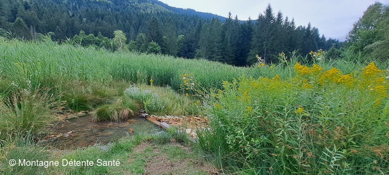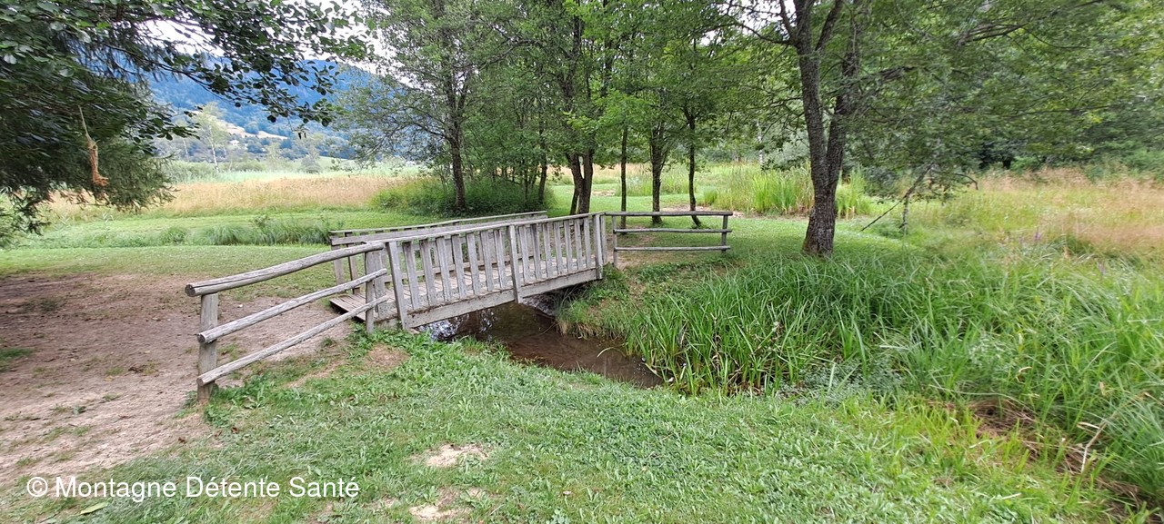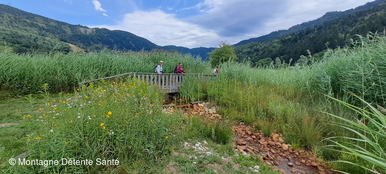 Nous traversons pour emprunter le chemin qui suit le Gelon et traverse les champs où paturent les vaches de race Hérens. Un taureau fait une pause au bord du cours d'eau. Nous passons derrière lui sans chercher à le déranger. Nous arrivons sur le "Chemin de la Carrière" et le prenons à droite. Au croisement nous allons à gauche et arrivons sur le GR 738 (alt 888m). Par la gauche nous descendons jusqu'à la passerelle qui enjambe le "Ruisseau de Nant Chat". Nous la traversons et gardons le chemin jusqu'au "Marais du Pontet". Nous faisons le tour de découverte parfaitement aménagé.