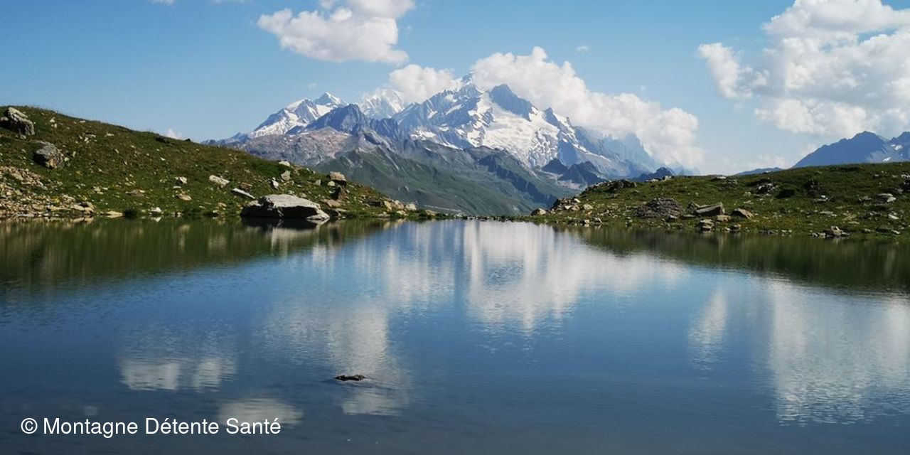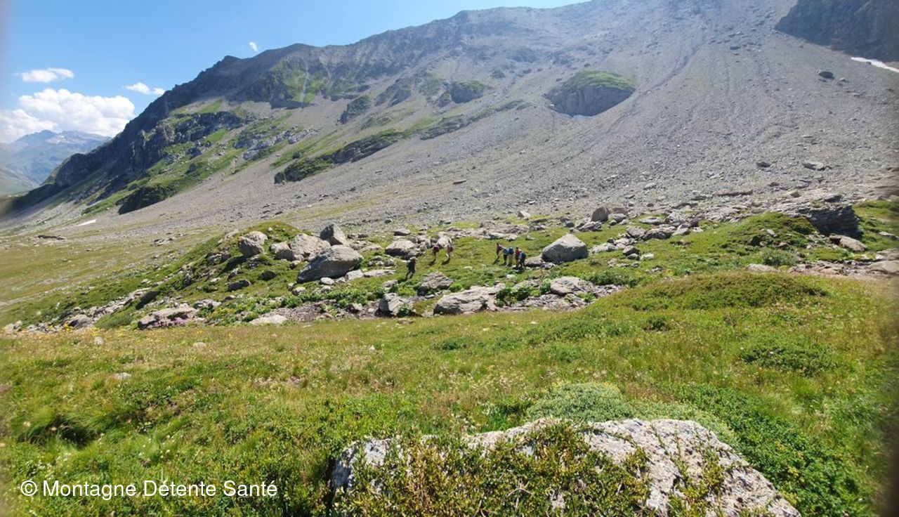 Un captage amenant l’eau au chalet nous facilite la tâche: il suffit de suivre le tuyau… Après avoir contourné une falaise, le lac apparait et une descente dans des éboulis nous permet d’admirer encore la flore encore très présente et variée vue durant la montée. Pause casse-croute en admirant ce lac dans lequel le Mont Blanc au loin se réfléchi. Puis c’est la descente vers le fameux glacier rocheux. Il est facilement atteint, mais une appréciation trompeuse sur le terrain fait choisir un itinéraire à travers les rochers qui s’avère ne pas être le bon.