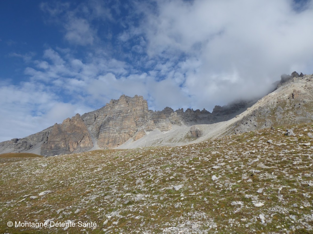 La montée est douce, les jambes ont besoin de récupérer un peu, le paysage est très sauvage de chaque côté du col, les couleurs de l'automne sont déjà là. A la descente, il existe une option pour rejoindre notre refuge, option que nous ne retenons pas, les nuages arrivant (encore !), Nous poursuivons jusqu'à notre gîte pour atteindre la forêt essentiellement constituéee de mélèzes et de pins, puis le hameau de Souliers où se trouve notre gîte pour la nuit.