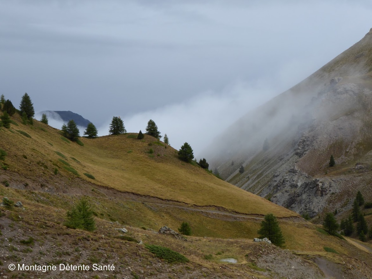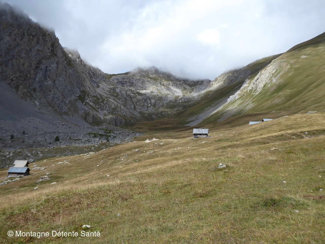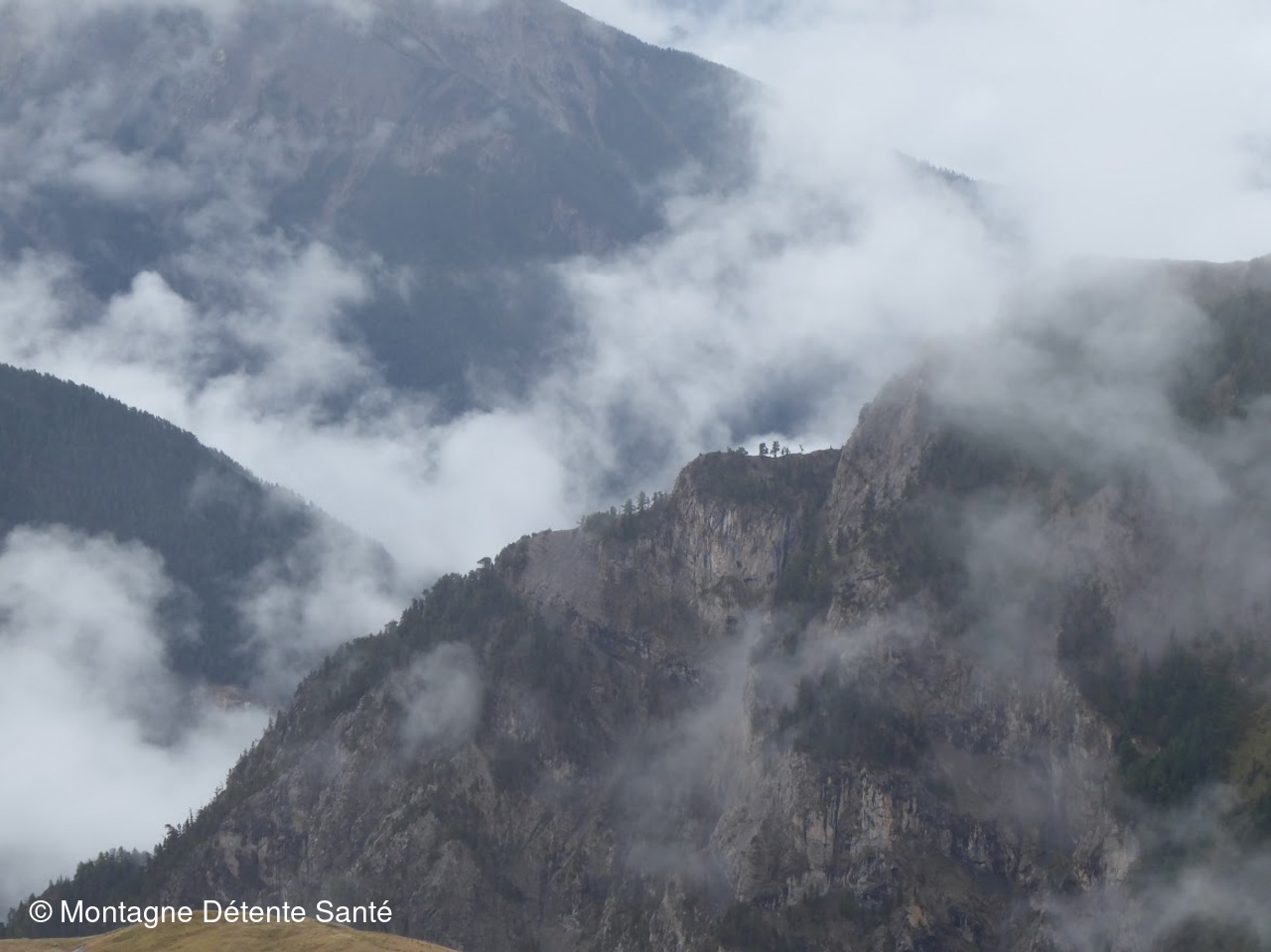 Montée en direction du col comme prévue sous la pluie parfois assez forte, puis éclaircie vers 11 h. Quels contrastes en quelques minutes, les couleurs jaune/orange de l'automne ressortent sous les nuages. Au col, le temps est plutôt bien orienté mais cela ne dure que quelques minutes et la décision est prise de se mettre à l'abri au refuge un peu plus bas, le dortoir étant libre, nous nous installons ... avec une petite sieste en ligne de mire.