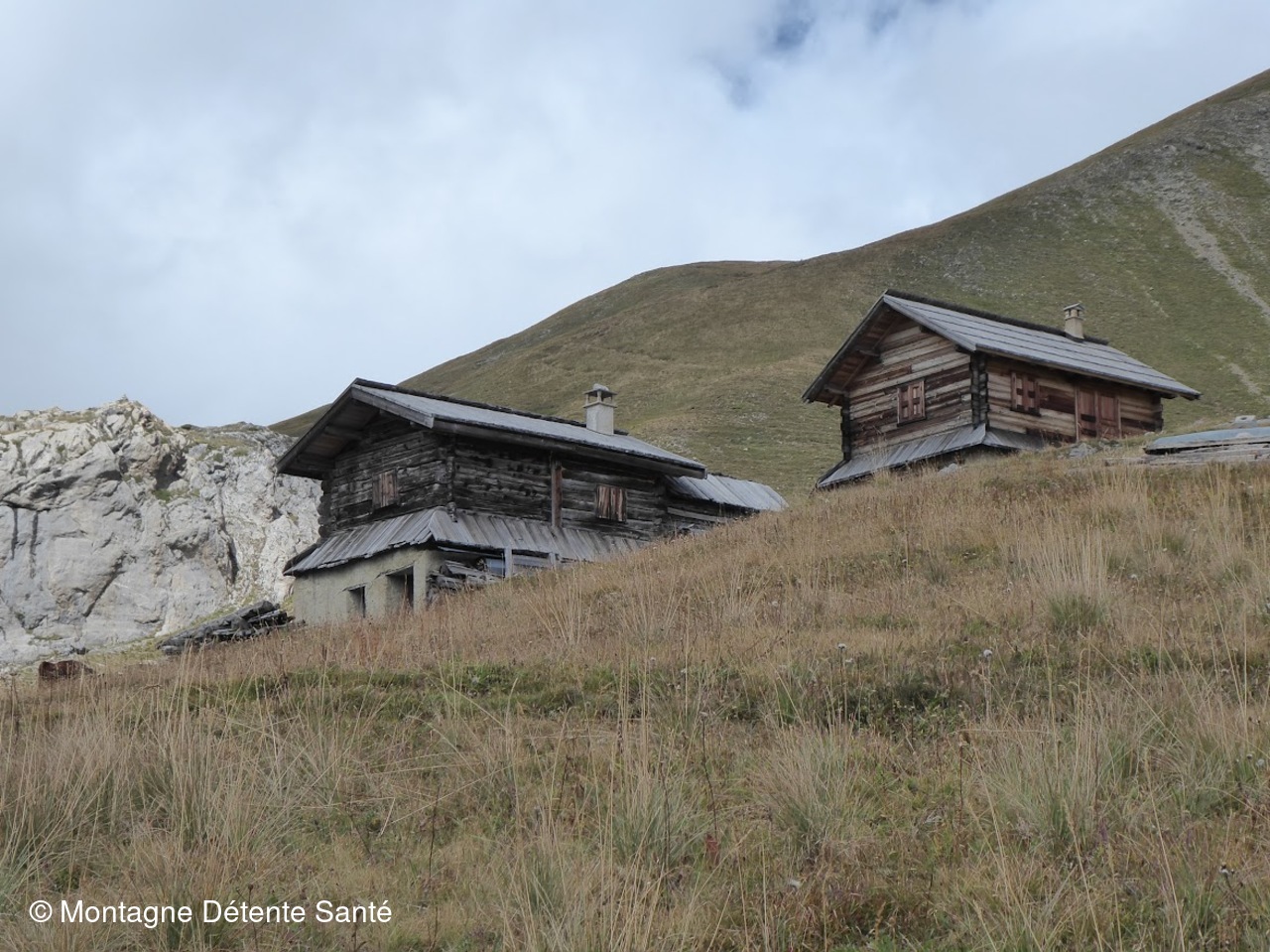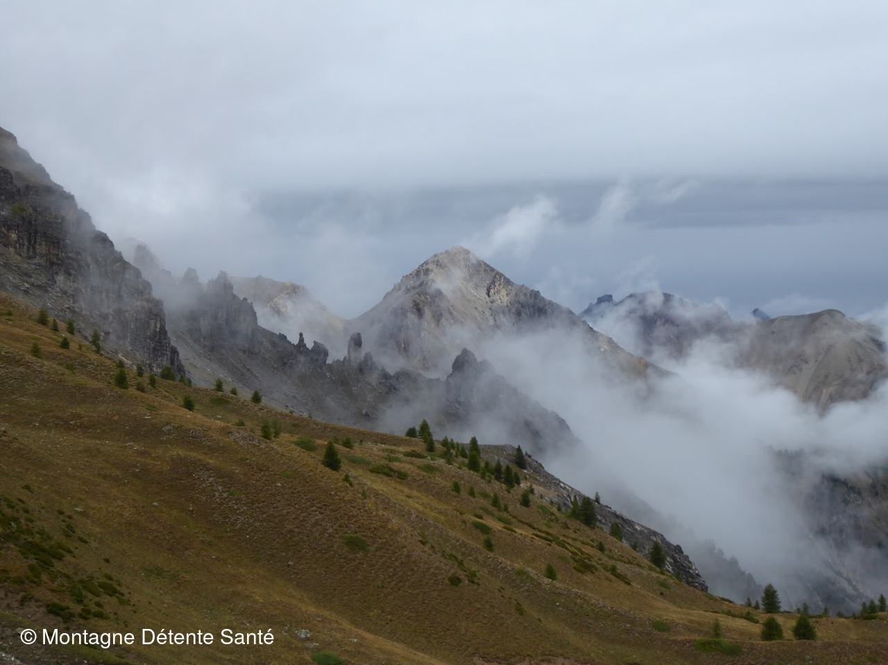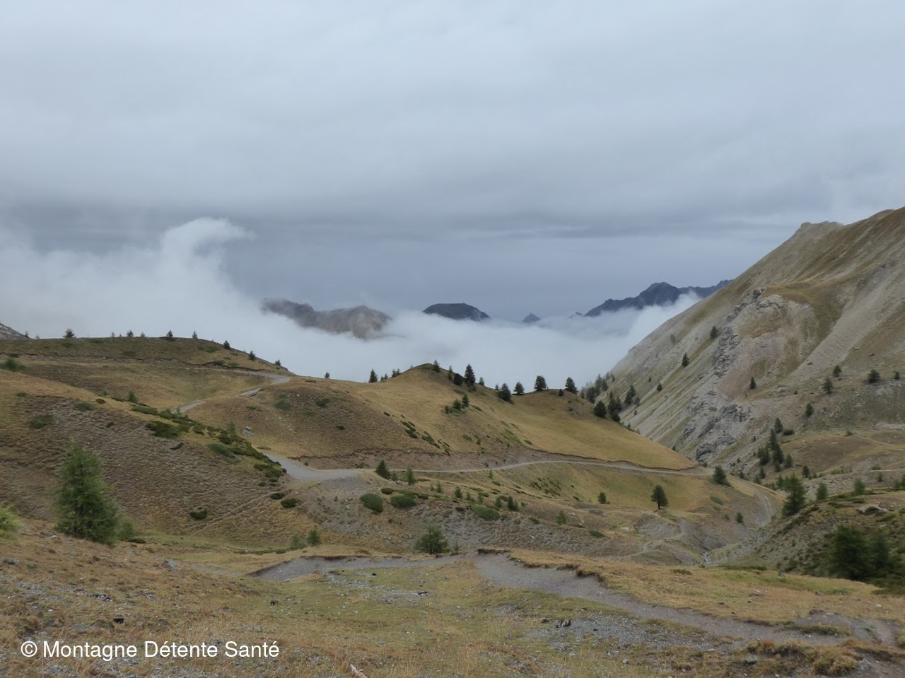 Montée en direction du col comme prévue sous la pluie parfois assez forte, puis éclaircie vers 11 h. Quels contrastes en quelques minutes, les couleurs jaune/orange de l'automne ressortent sous les nuages. Au col, le temps est plutôt bien orienté mais cela ne dure que quelques minutes et la décision est prise de se mettre à l'abri au refuge un peu plus bas, le dortoir étant libre, nous nous installons ... avec une petite sieste en ligne de mire.