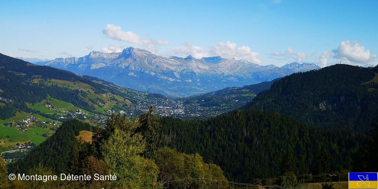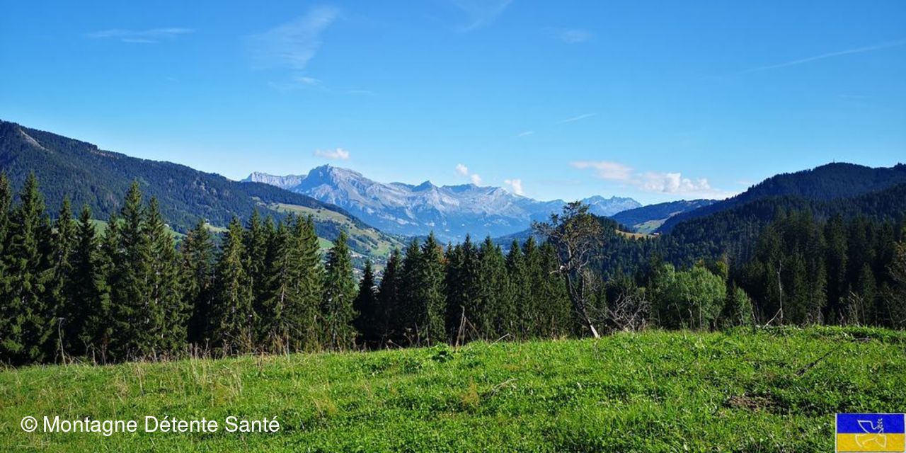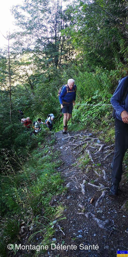 Après un peu plus d’un kilomètre de descente, le lac est atteint. Que fait-on maintenant ? Tout d’abord on continue un peu, puis on commence à remonter les 200 m descendus. Tout d’abord, par une piste de ski raisonnablement pentue, on se retrouve à l’altitude du départ. Puis, en avant pour 270 m de montée, cette fois plus soutenue avec des passages biens sécurisés par un câble. Le topo de référence mentionnait «courts passages câblés», mais je n’avais pas vu le «s» ... En montée ils nous ont aidés mais si on avait dû le faire en descente, ces câbles auraient été de première nécessité, la rosée du matin ayant laissé les pierres bien humides. Une belle vue sur le Mont Blanc nous attendait avant les derniers mètres de grimpette pour atteindre un magnifique point de vue sur cette partie mal connue de nos Alpes, tout au moins pour la plupart d’entre nous : les Fiz et le Désert de Platé et la Montagne d'Anterne, la chaîne du Mont Blanc dans sa quasi intégralité avec les Dômes de Miage d’un côté et de l’autre, l’aiguille du Midi et l’Aiguille Verte entr'autre, les sommets jouant à cache-cache avec les nuages. Des tables nous attendaient pour le pique-nique, mais les nuages nous ont invité à abréger ce moment. S’ensuit la descente puis un légère remontée sur le Roc des Evettes et enfin les voitures.