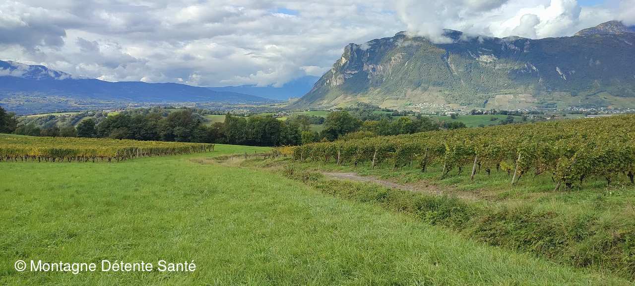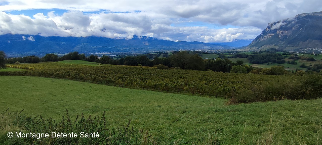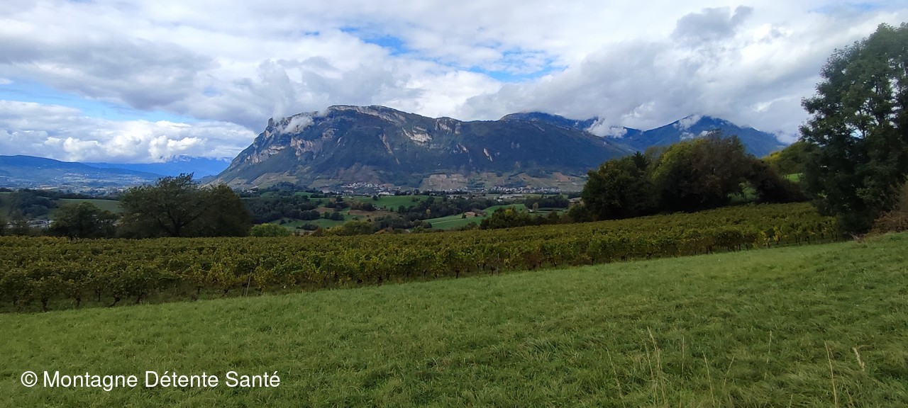 Un beau panorama s’offre à nous : au sud Barraux sous le massif de la Chartreuse, au centre la dent du Chat et le massif de l’Epine, la vue s’étend au nord jusqu’à St Pierre-d’Albigny au pied des Bauges.