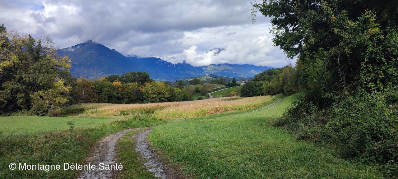Une piste en balcon, bien ensoleillée nous conduit jusqu’au petit village de Villarbet avec une magnifique vue sur la plaine de Francin et ses couleurs d’automne.