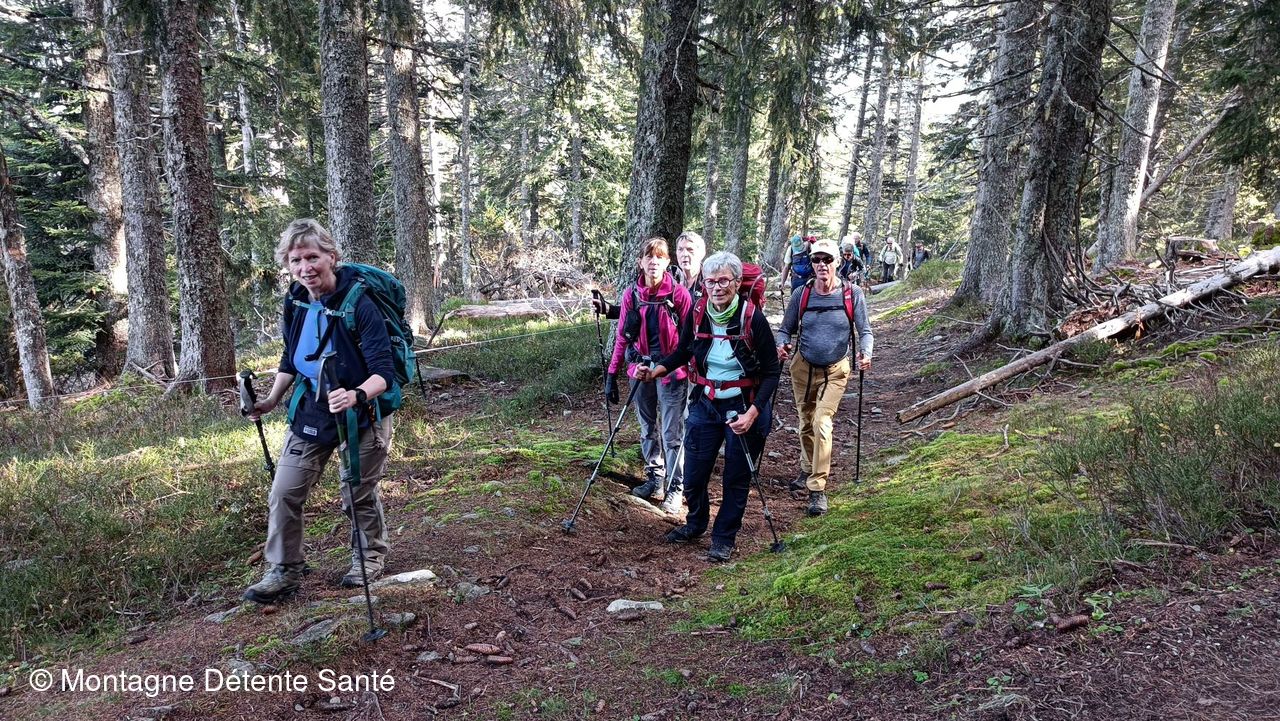 Ensuite nous abordons une descente sous les résineux et nous avançons jusqu'au Grand Leyat, une tourbière. Puis nous la contournons pour remonter dans les bois sur des tapis d'aiguilles ce qui rend la marche plus souple et redescendons sur le col du Champet baigné de soleil. Après une prise d'énergie nous attaquons la montée pour atteindre le Grand Chat.