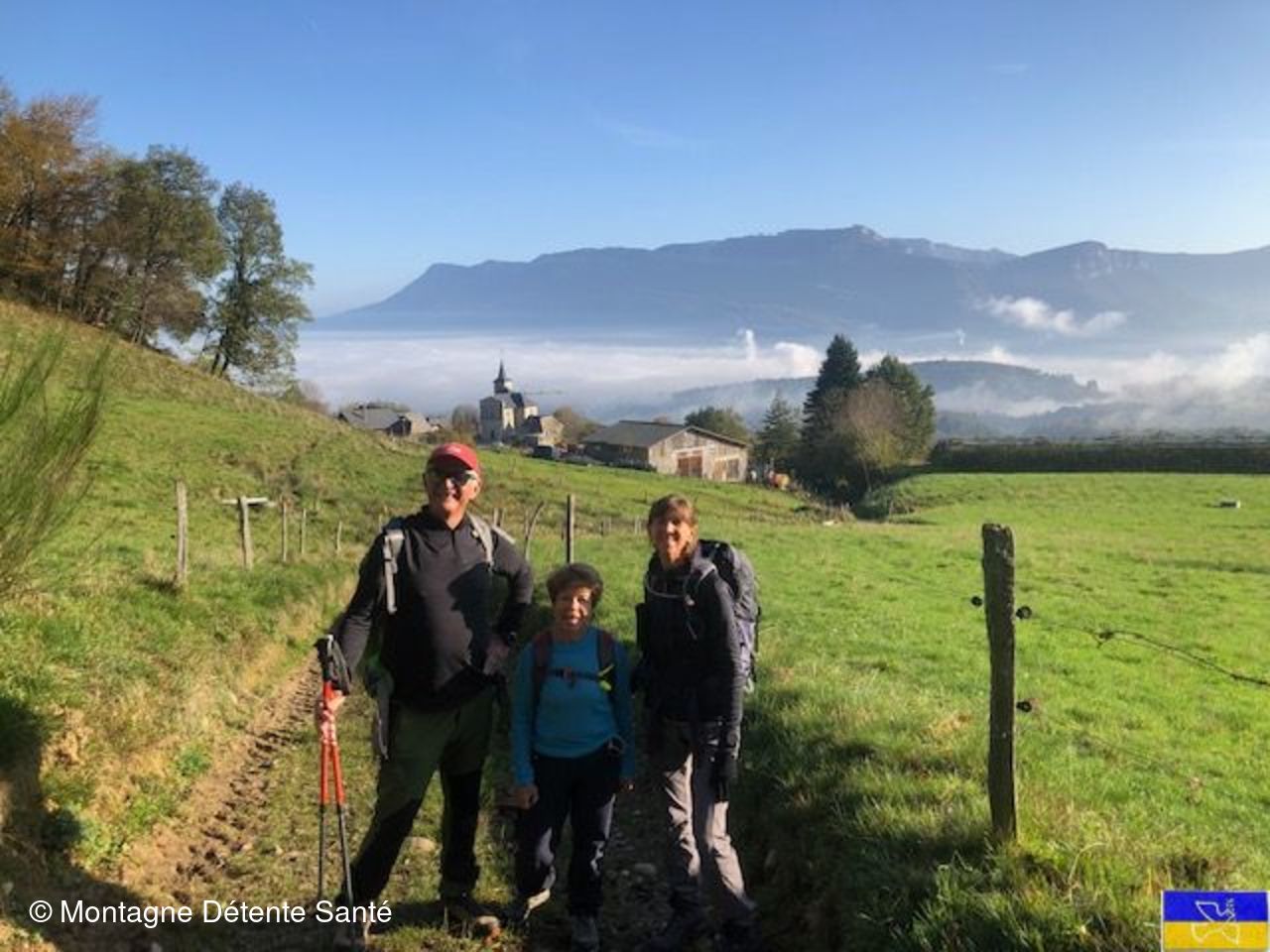 Mais, à notre arrivée à St Sulpice, la vue fastueuse sur la Cluse de Chambéry et sur le lac du Bourget sortant des limbes nous redonnait de l'énergie. La montée par la voie sarde jusqu'au Col du Crucifix (915 m) s'averra très facile et rapide. Nous avons pu vérifier en chemin, l'avancement des travaux de restauration de cet itinéraire historique, financé en partie par la mission Bern de 2023.