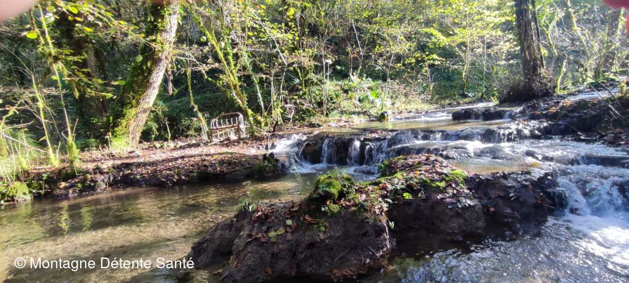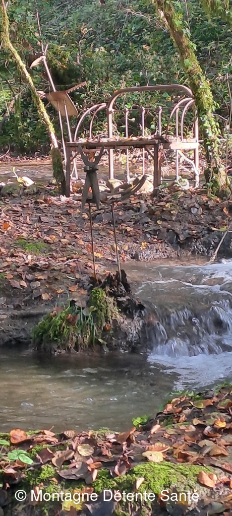 Là, se trouve un coin bucolique, propice aux fougères scolopendre. Au bord du ruisseau il y a un petit banc en fer forgé, un second lui fait face ainsi que deux sculptures faites de récupérations d'outils agricoles. À cette époque et heure, la lumière y donne une belle ambiance. Nous prenons le temps de nous y poser quelques minutes et faire des photos.