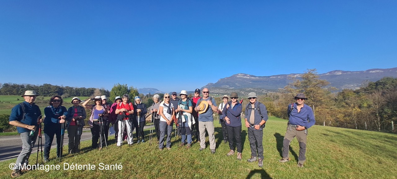 Nous passons derrière le bâtiment de la mairie (wc public si besoin) et l'église pour rejoindre le chemin qui descend doucement jusqu'au hameau de "Les Janins". En file indienne, nous longeons par la gauche sur 250 m la D41 pour arriver sur un chemin qui part à gauche vers le hameau de "Les Moirouds". Petite pause boisson et le temps d'une photo.