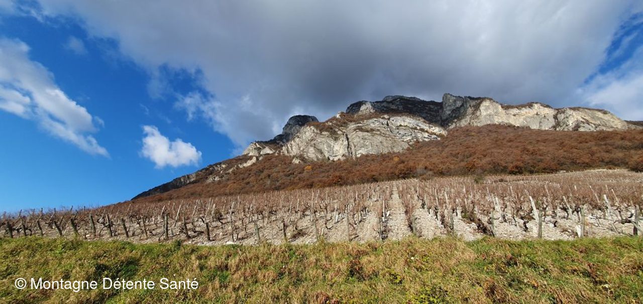 Balade sans difficulté en direction de Tormery, belle vue sur la Savoyarde, le vignoble de Chignin, le Granier, la vallée du Grésivaudan, les Belledonnes et la Lauzière enneigées.