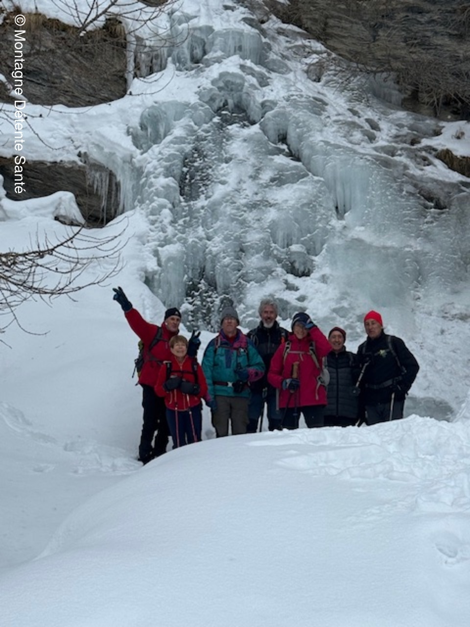 Départ depuis la Chalp, nous suivons le torrent de Curlet jusqu'au pont du Moulin et remontons le torrent et pique-nique. Ensuite, petit écart pour voir la cascade sur le Rif de Lamaron, cascade toute en glace qui avait été vue en conditions estivales lors du premier trek dans le Queyras, il y a deux ans. Nous poursuivons en direction de St-Véran via le hameau du Raux puis traversée du village, passage devant l'oratoire de la Ste Vierge et descente à notre gîte via la discothèque !