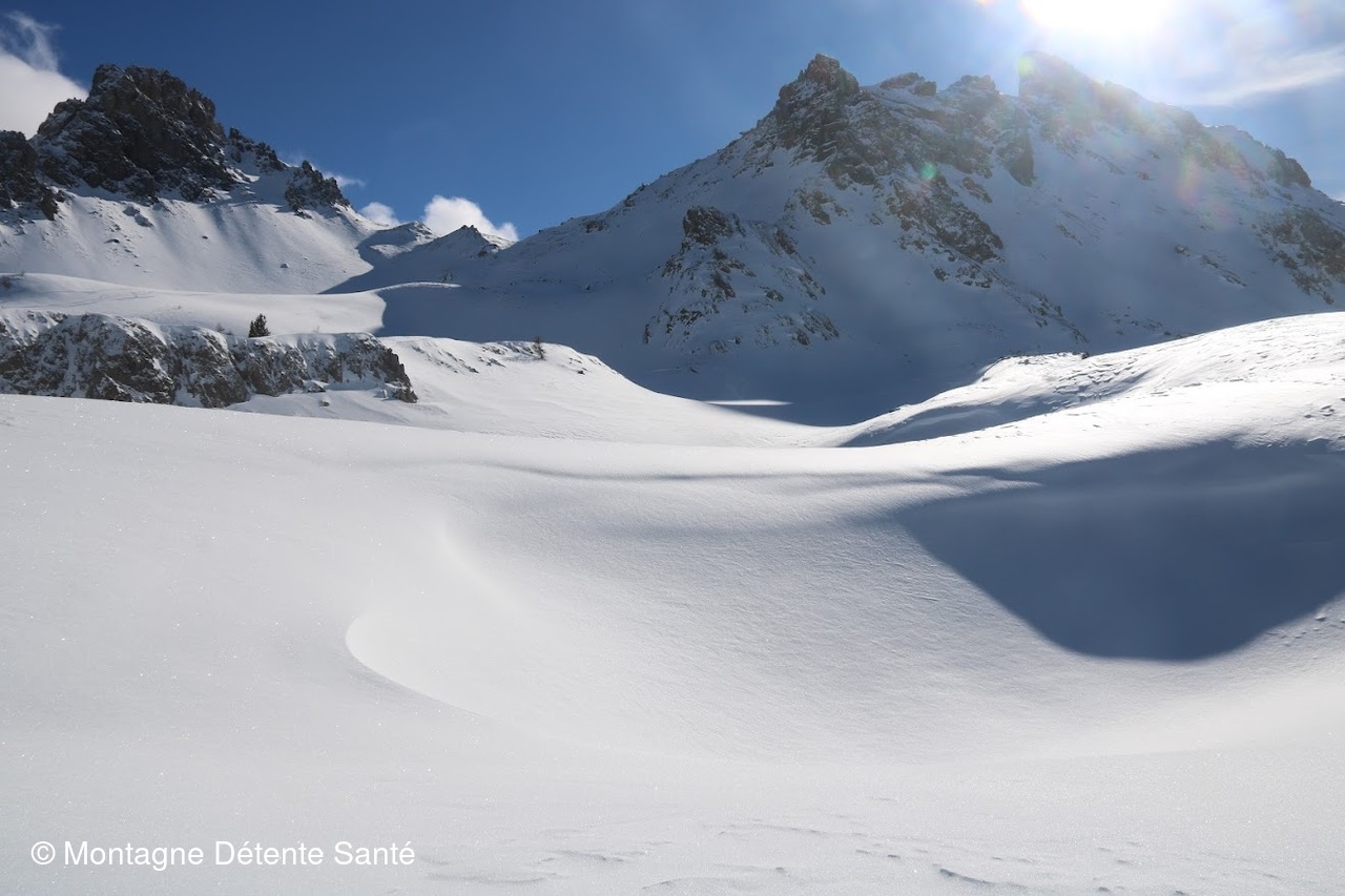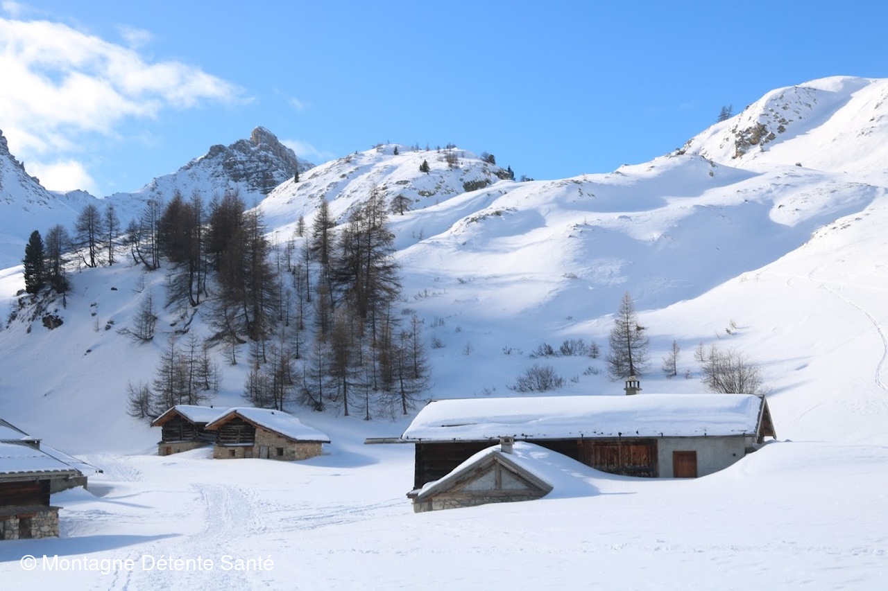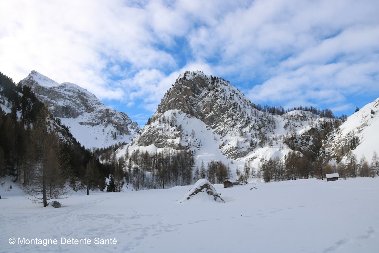 Départ depuis le foyer nordique de Brunissard au dessus d'Arvieux. Le beau temps annoncé pour cette journée a convaincu bon nombre de randonneurs à pied, raquettes, ski de fond, ski de rando. Nous empruntons un parcours partagé, parcours tantôt en forêt, tantôt plus dégagé, traversons le pré des Vaches. Les choses sérieuses commencent, la montée est beaucoup plus prononcée le long des falaises du pic de Beaudouis, la neige aussi devient très présente, néanmoins nous continuons en crampons jusqu'à l'Eychaillon, petit replat avec quelques chalets et son lac enneigé et enfin un dernier effort pour atteindre les chalets de Clapeyto. Très beau site préservé, avec beaucoup de neige (les raquettes deviennent indispensables), ses chalets typiques, vue dégagée sur les pics environnants avec un soleil très présent.