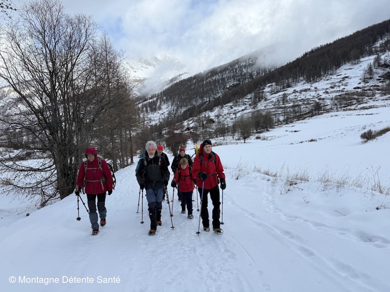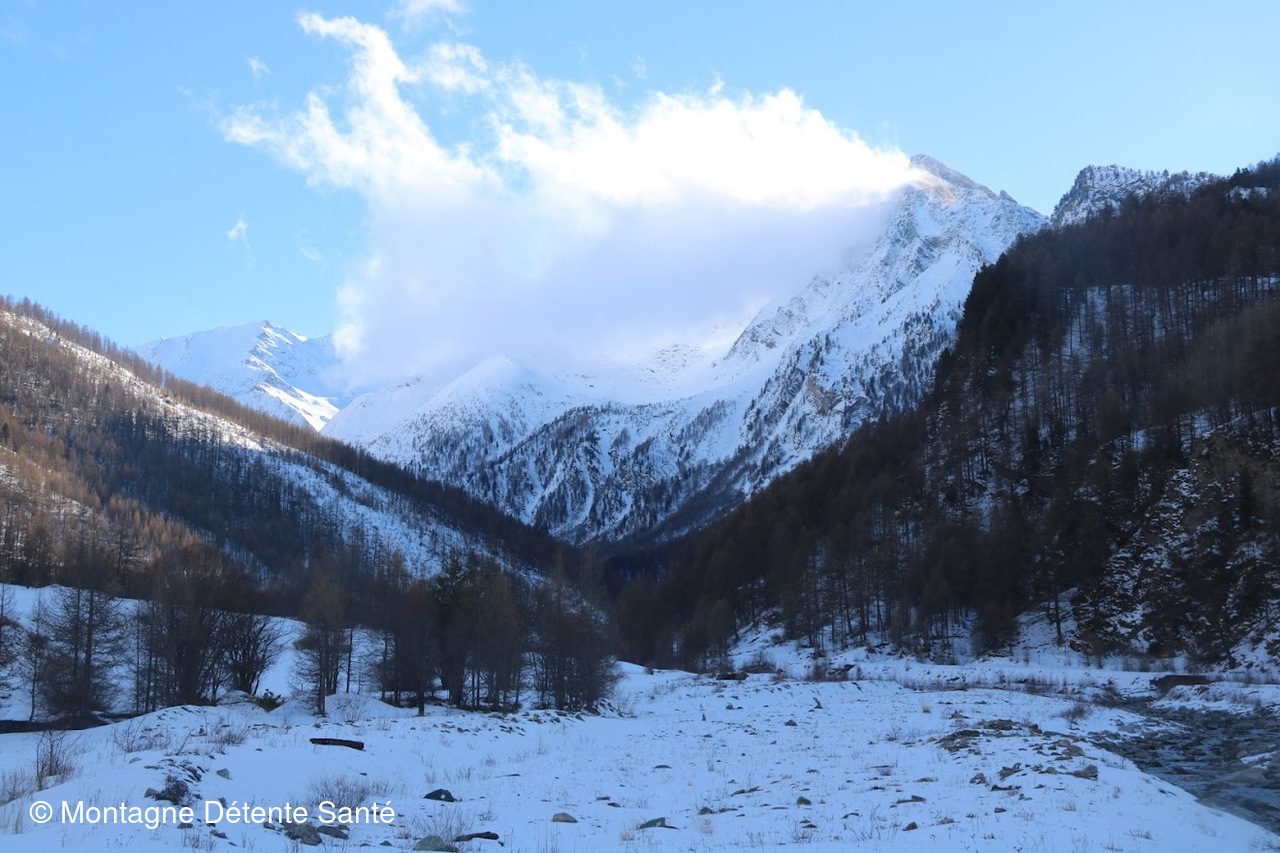 Départ depuis l'Echalp, dernier hameau de la vallée. Nous longeons le torrent du Guil via un sentier partagé ski de fond / raquettes / piétons, passons devant la roche écroulée, puis obliquons en direction du grand belvédère du Mont Viso. Durant la montée nous prenons le temps d'observer quelques chamois, nous continuons jusqu'à un endroit plus dégagé pour notre pause pique-nique, le Mont Viso est juste devant nous mais bien embrumé.