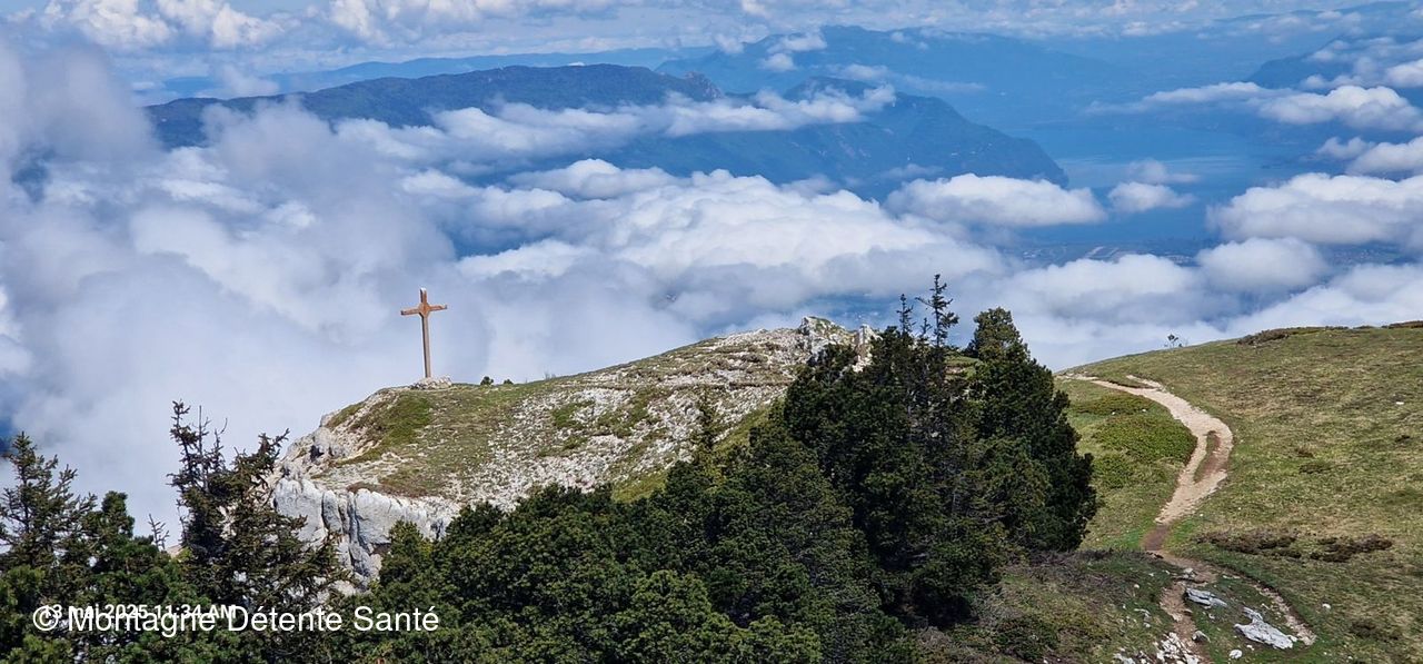Maintenant les choses sérieuses commencent. Le passage des barres est là et il faut s’aider des mains pour gravir la faille assez verticale dans la falaise. Celle-ci est équipée de câbles et d’échelles. Ainsi, nous accédons au vaste plateau du Granier et profitons d’une belle vue sur les massifs environnants mais aussi sur la vallée du Grésivaudan et la Combe de Savoie. Le cheminement sur le plateau est agréable et le sommet du Granier (1933m) est atteint. Une petite descente nous permet d’arriver à la croix dont l’approche est interdite depuis les éboulements de 2017. Ici, la vue est superbe sur Chambéry, le lac du Bourget, le Mont Blanc et le vignoble des Abymes.