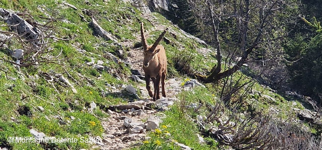 Nous apercevons notre premier chamois. Un peu plus loin, sur notre sentier, nous voyons arriver en face un bouquetin, nous l’observons, il poursuit son chemin tranquillement dans notre direction et à quelques mètres de nous nous, il fait un détour pour nous éviter. Nous avons pleinement apprécié cette sympathique scène.