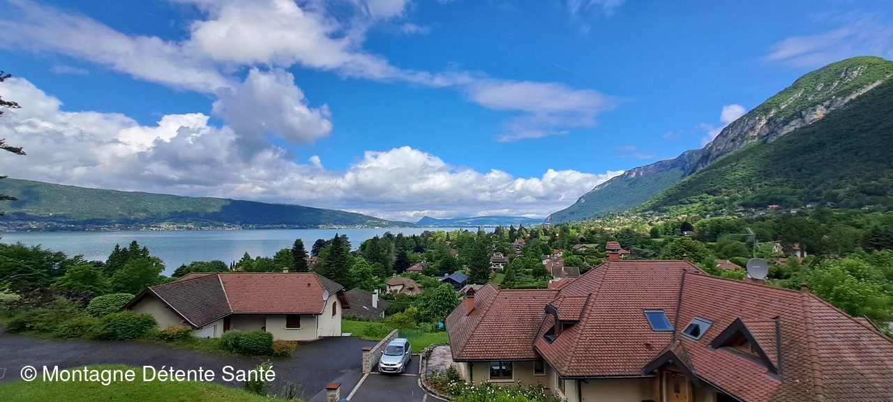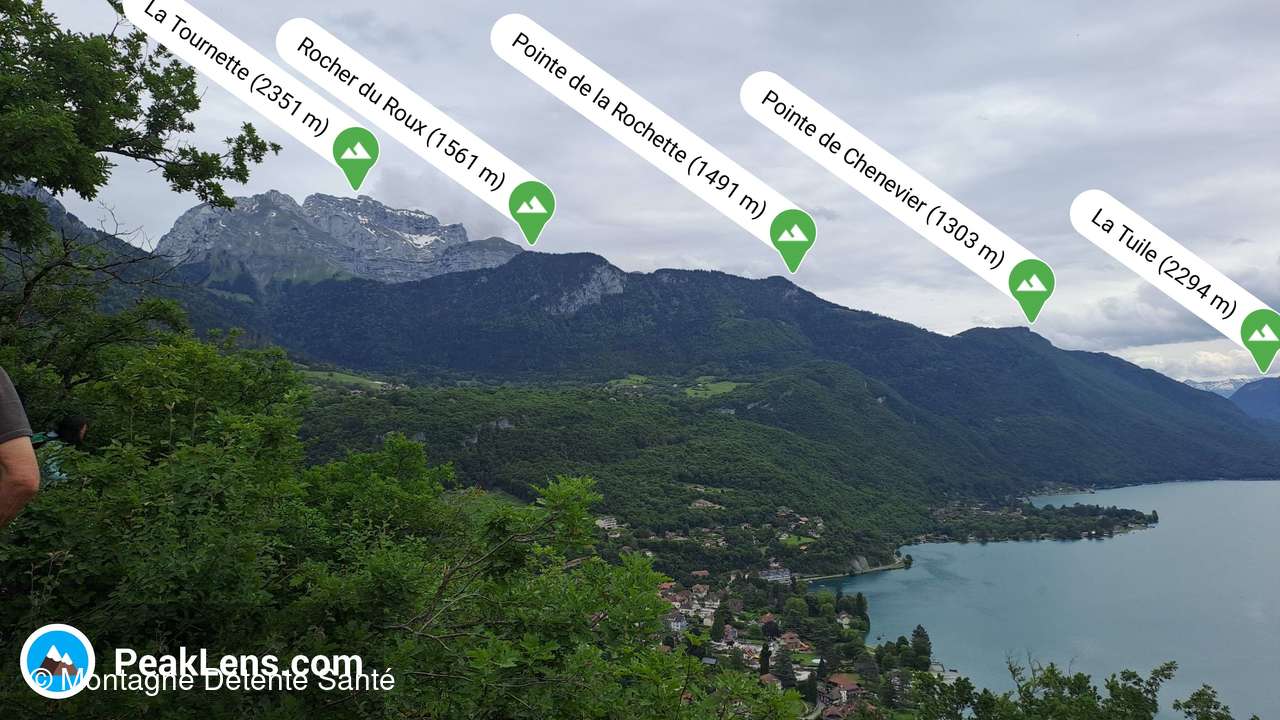 Nous prenons la direction de l'Est puis montons jusqu'au Point de vue du Roc de Chère. Nous avons une vue sur le Lac d'Annecy, le Domaine de Châteauvieux à Duingt, Saint-Jorioz, Doussard au sud. Sevrier vers l'Ouest. Nous nous posons pour le temps du casse-croûte.
