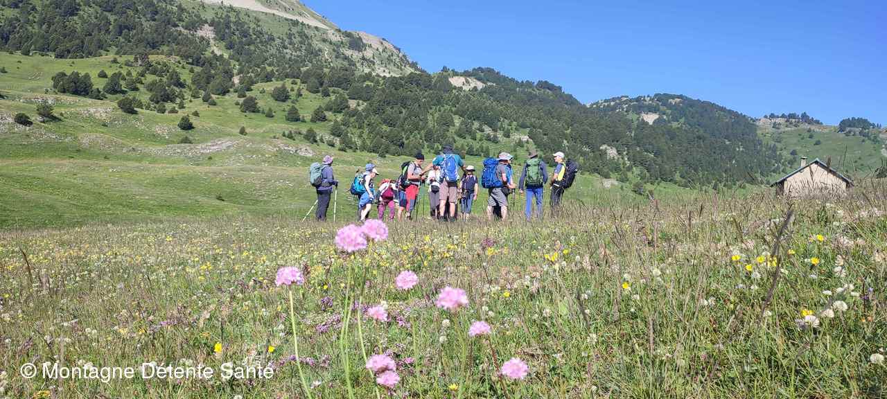 Notre joyeuse troupe démarre l’ascension sur un chemin longeant les pâturages et bordé de milliers de fleurs. Quelle chance d’avoir avec nous Christiane, botaniste, qui nous raconte tout sur cette flore magnifique ! Un bois de hêtres nous apporte une ombre fraiche et bien agréable, mais bientôt il n’y a plus que quelques pins de-ci de-là qui feront office de parasols. Nous passons une grosse bergerie, puis la cabane de l’Essaure. Rencontre avec une famille cheminant avec des ânes...les enfants adorent !