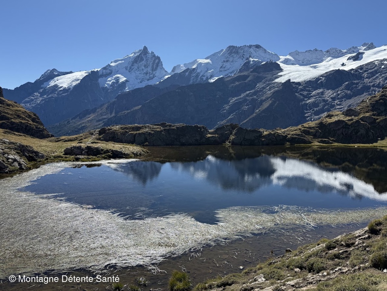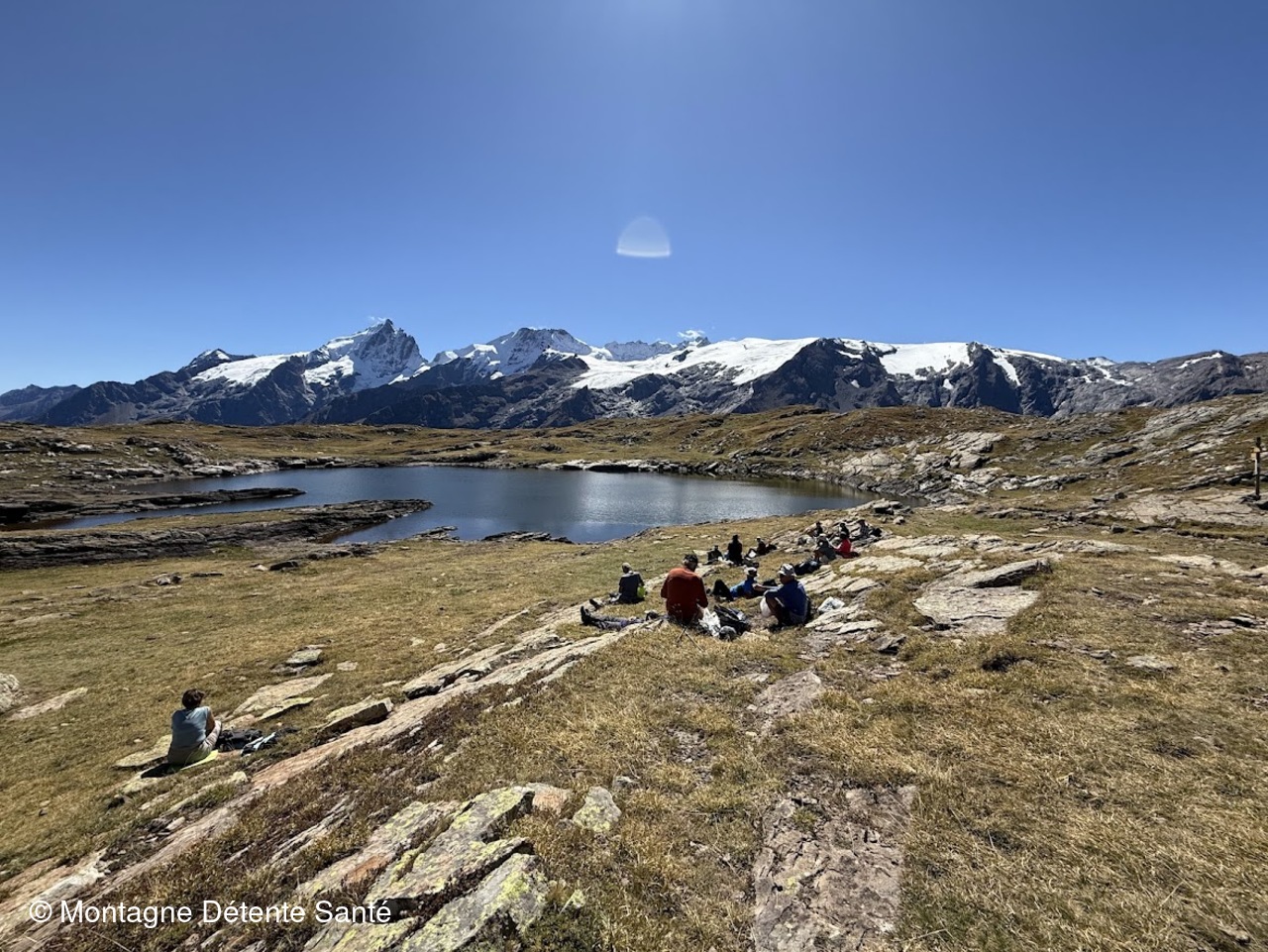 Arrivés au lac Lérié, peut-être par mimétisme, tous les appareils photos et téléphones sont de sortie, il faut dire que la vue est particulièrement belle, les sommets enneigés se mirent dans le lac. Même une hermine qui passait par là ni les edelweiss n'ont pas eu le succès escompté ! Nous reprenons notre marche vers le lac Noir, où nous ferons notre halte pique-nique toujours dans un cadre somptueux