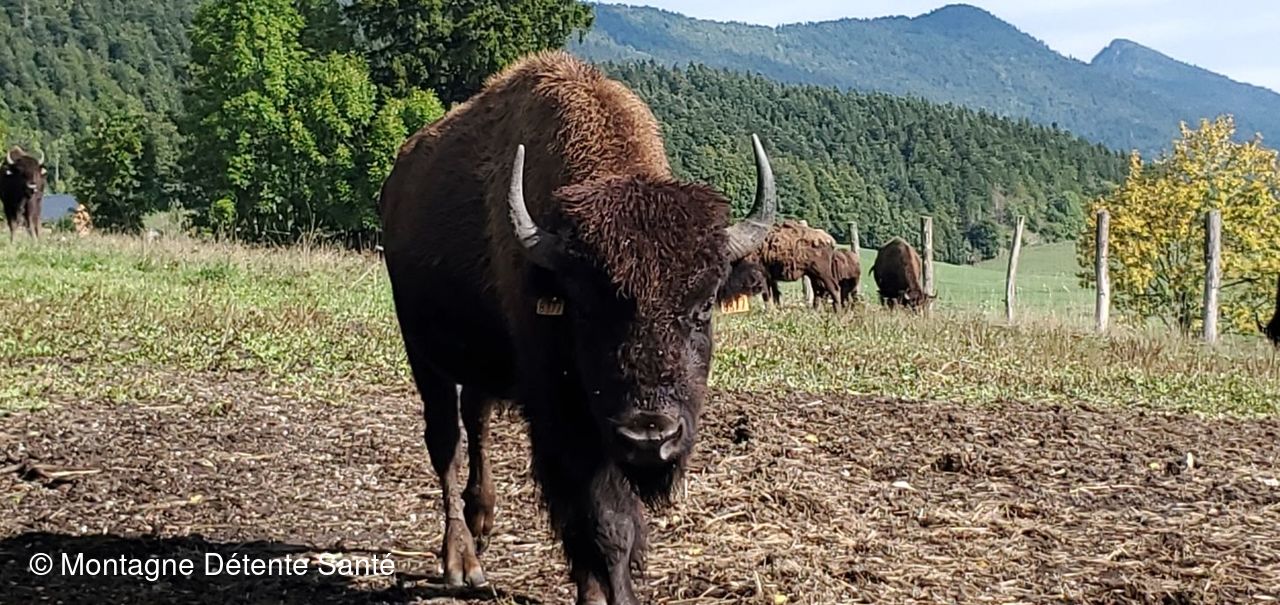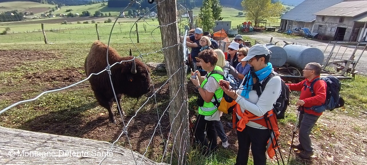Après une belle soirée et une bonne nuit à l'Arcanson, notre joyeux groupe est parti sous le soleil à la rencontre des bisons du Vercors, ils se sont laissés admirés un bon moment. Nous avons croisé une structure artificielle d'entraînement à la spéléologie. Joli circuit sur le plateau avant de reprendre nos véhicules pour nous rendre au Plan des Narces. Petit complément de marche à travers un bois égayé par un jeu de piste à la recherche d'Ursuline jusqu'au point de vue du Crêt (beau belvédère sur le plateau) où nous avons pique-niqué. Dernière marche jusqu'à nos voitures, arrêt café au refuge des Narces en descendant puis voyage du retour.