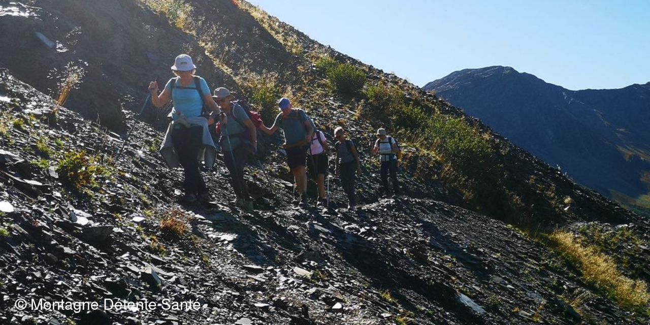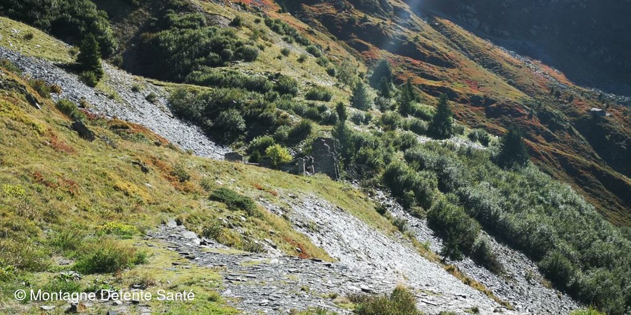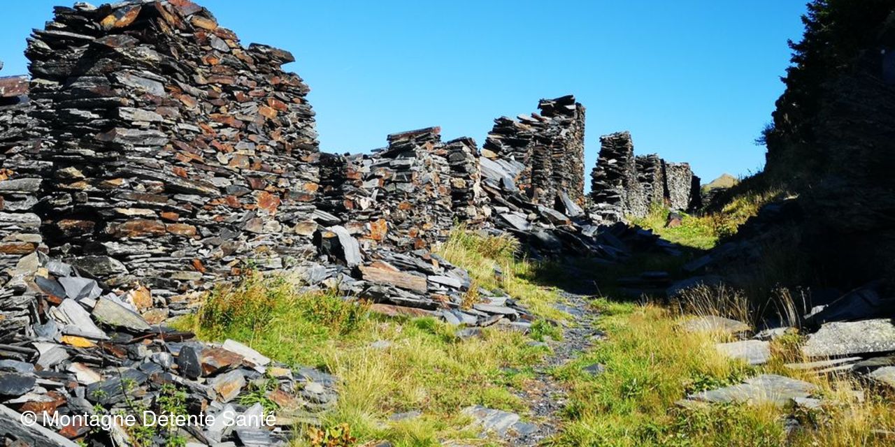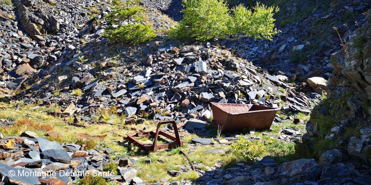 Sortie patrimoine aujourd’hui, aux ardoisières de Cevin et la Bathie dans ce magnifique écrin classé grand site depuis 2019. Départ de la Ravoire, en douceur, direction Bénétant. La pente est faible jusqu’à la bifurcation quand on quitte le chemin de Bénétant. Elle devient plus soutenue sans jamais être pénible et nous voilà arrivés aux Ardoisières de Cevin, sur la place du petit hameau qui s’était constitué pour héberger les ardoisiers. Panneau explicatif, rails, berlines nous aident à imaginer le dur travail que ces hommes ont effectué. Quant au tas d’ardoises mal taillées, ils montrent combien ce site a été productif. Et il a fallu les traverser, en dévers, ces épanchements d’ardoises. Mais il fait sec et le chemin est somme toute bien marqué. Midi approche et comme on s’était fixé les Ardoisières de la Bathie pour le casse-croûte, nous nous remettons en route pour une demi heure de marche avec quelques passages sur ces étendues d’ardoises. L’ardoisière est plus petite, mais il y a de la place pour tout le monde. La douceur de cette journée nous autorise à rester un bon moment à contempler les pentes entre la Dormiaz, la Pointe Lavouet et le Col de la Bathie: le vert des pâturages est ponctué du rouge des myrtillers et c’est de toute beauté.