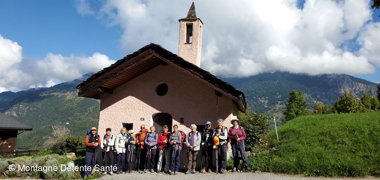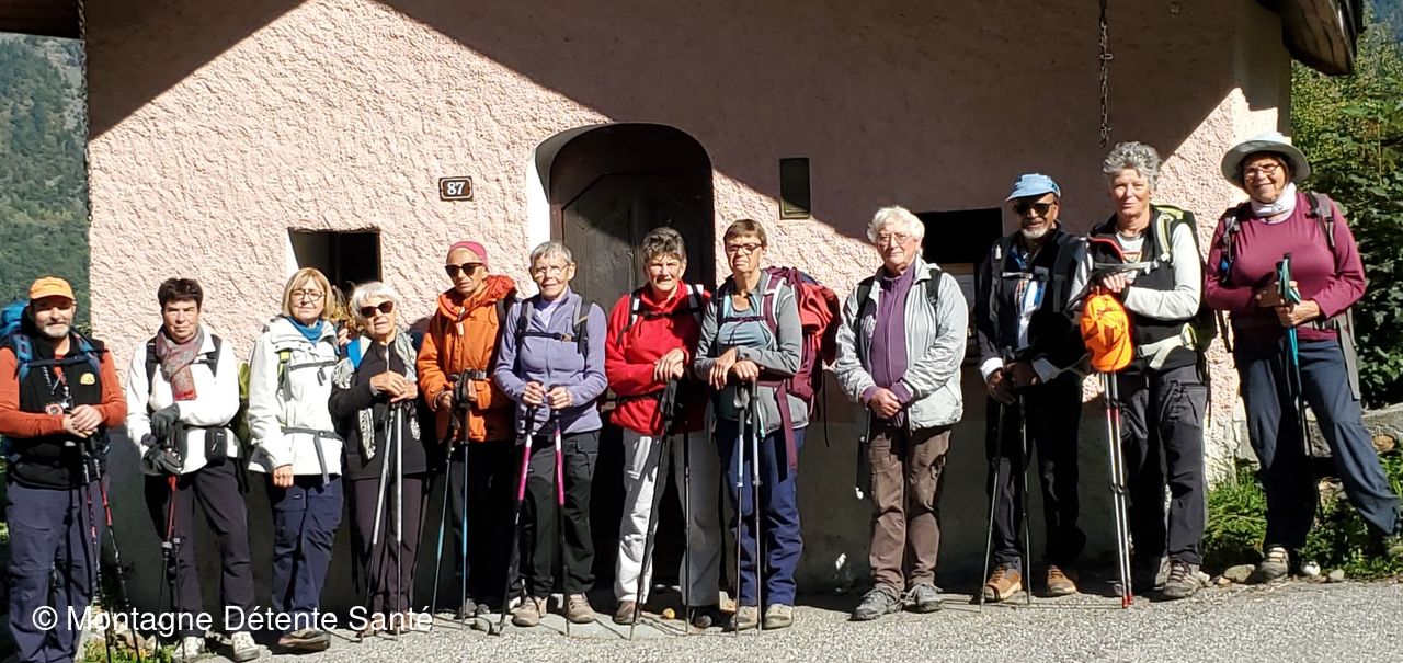 Passage devant la petite chapelle avec photo de notre groupe. Nous avons alors courageusement fait le plus gros du dénivelé plus ou moins le long de la route du Freney pour arriver au-dessus du petit lac du Praz.