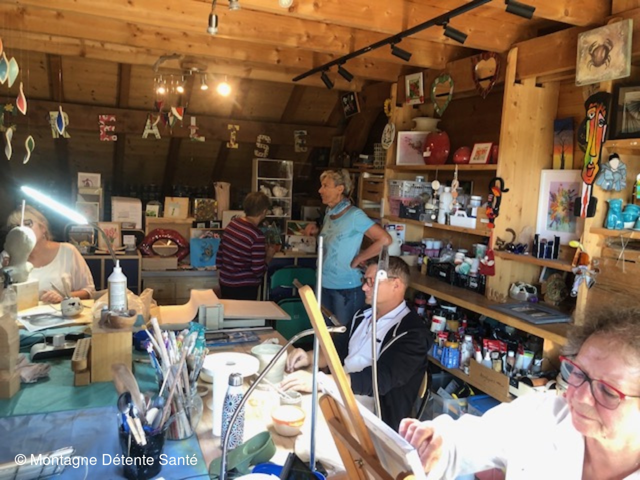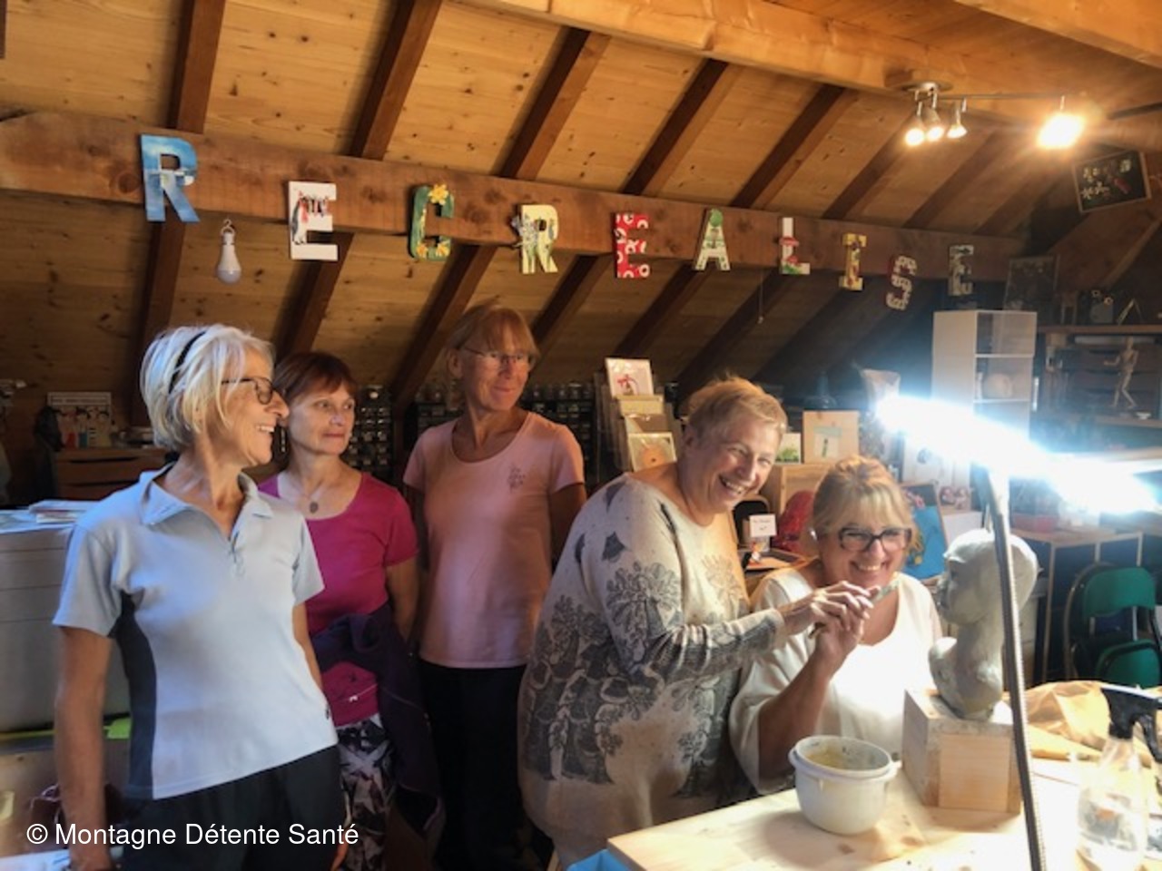 Une surprise nous attendait : la visite de la maison-atelier Récréalise, animée par l'artiste Lise Chatelain où outre ses productions, accueille les personnes désirant apprendre et pratiquer diverses techniques artistiques telles que le dessin-peinture, la mosaïque, l'art du vitrail, le chantournage, le modelage-sculpture dans un lieu en pleine nature, acceuillant et inspirant. Aujourd'hui 4 élèves officiaient en pleine création dans les domaines de la peinture, de la scupture et de la poterie.