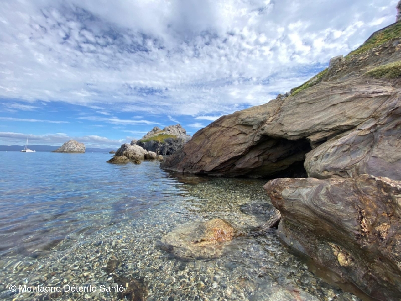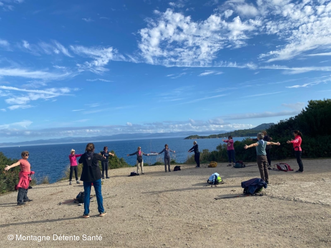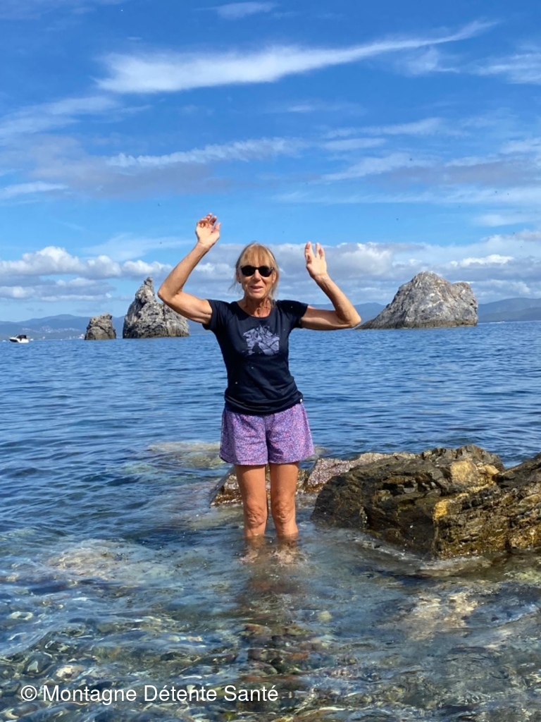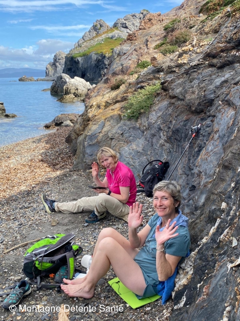 Débarquées au port nous grimpons sur un chemin qui domine la grande bleue pour effectuer notre atelier DO IN. Quelle vue ! Du bleu, du bleu et encore du bleu qui monte jusqu’au ciel.
