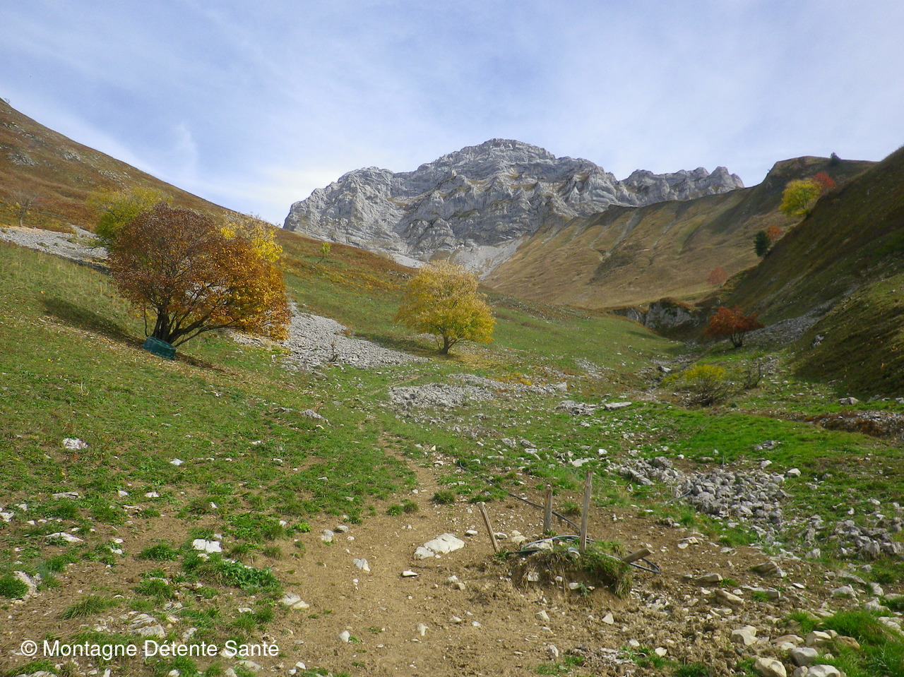 Dans l'alpage, nous avons pris la direction du Passage de Massoly qui nous a offert une belle vue sur la Combe très ravinée des Grands Lanches sous le contrefort de la Pointe d'Arcalod et de l'autre une aperçu du Bonnet de Cherel pointant ces 1979 m.