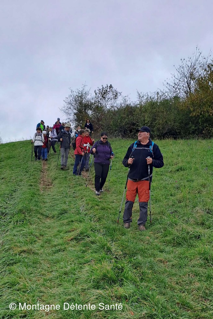 Nous devons traverser la D21b pour prendre le Chemin de Montron Joux. Nous montons vers l'Ouest et arrivons sur un poteau directionnel. Nous poursuivons tout droit et arrivons sur un croisement. Nous allons en direction Nord-Ouest et poursuivons notre montée jusqu'à un replat au sommet des vignobles. Nous montons à droite à travers les pâturages pour arriver à notre point culminant, le Mont Ronjou