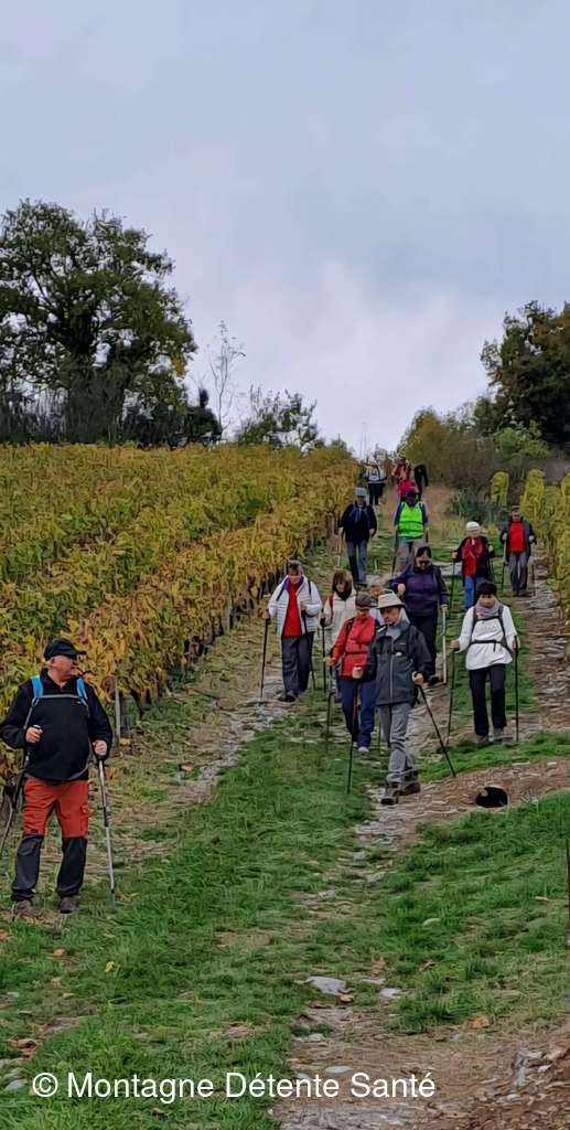 la Statue de la Vierge des Champs et des Vignes. Nous sommes sous les tours et non loin du Clos St-Anthelme. Nous prenons le temps d'une dernière photo de groupe. Nous poursuivons à gauche le Chemin de Saint-Anthelme et arrivons sur la D21b à hauteur de l'Église Saint-Pierre.  Nous descendons quelques mètres à droite pour traverser et emprunter le Chemin des Bugnons qui nous ramène sur le Clos Dénarié.