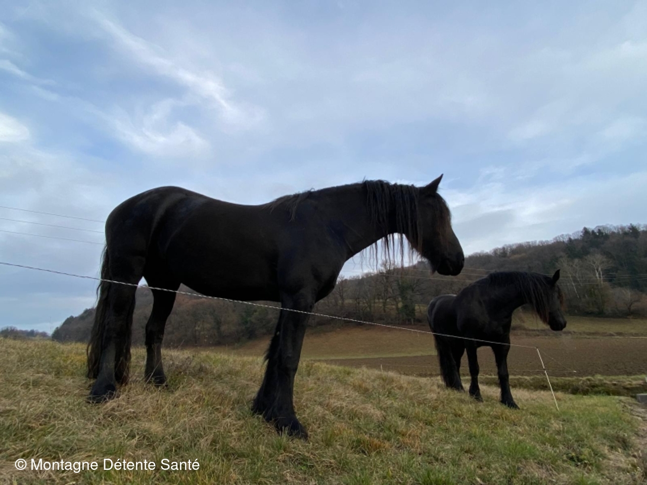 Nous le contournons et descendons, longeant noyers, vignes et sous-bois, puis nous passons les hameaux de Ste Anne, La Ronzière pour remonter ensuite sur Hautebise et la Chapelle Blanche. Rencontre avec de magnifiques chevaux.