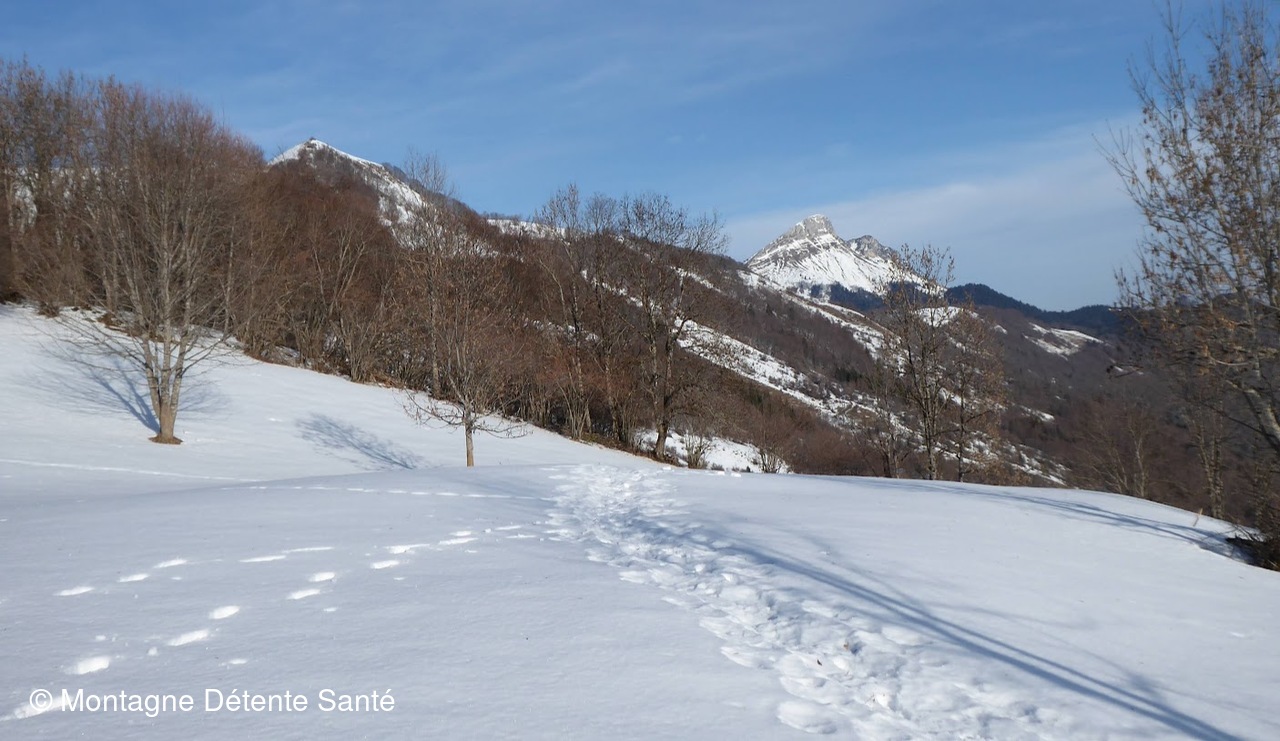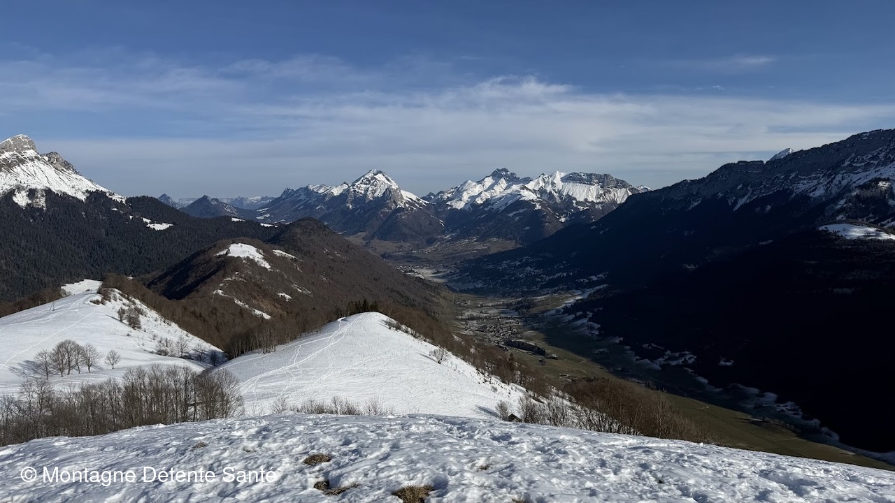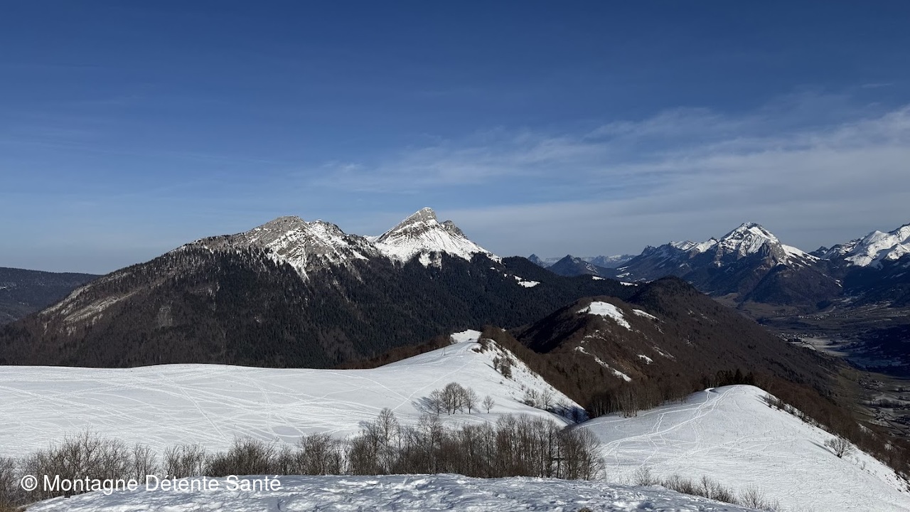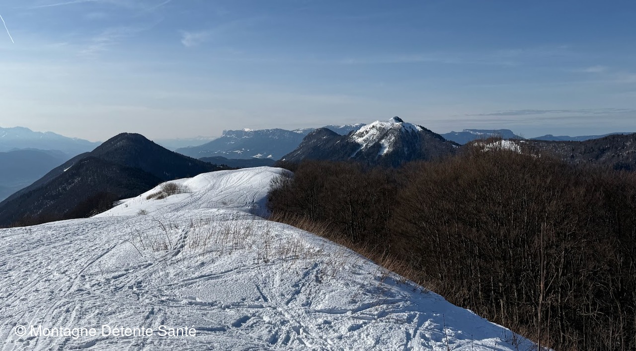 La pente est douce sur le 1er kilomètre, juste le temps de se réchauffer, ensuite, cela devient plus raide, nous continuons le sentier jusqu'au premier belvédère où nous marquons une petite pause, nous observons la combe de Savoie, le Grésivaudan jusqu'au Vercors. Il reste un peu de neige en sous-bois, et le soleil est de la partie.