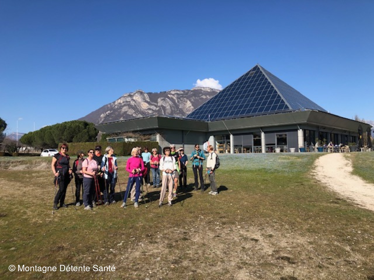 Ensuite, c'est déjà la reprise du chemin du retour par cette même digue que nous trouvons cette fois moins longue. Arrivés au niveau de la zone artisanale d'Alpespace, nous la traversons directement par la contre-allée de la voie directe Christophe Collomb qui nous dirige vers la Pyramide. Au bord de son lac, nous terminons l'après-midi par des exercices d'étirements. Le retour au parking de covoiturage se fait sans encombre en évitant le traditionnel bouchon de sortie des entreprises.