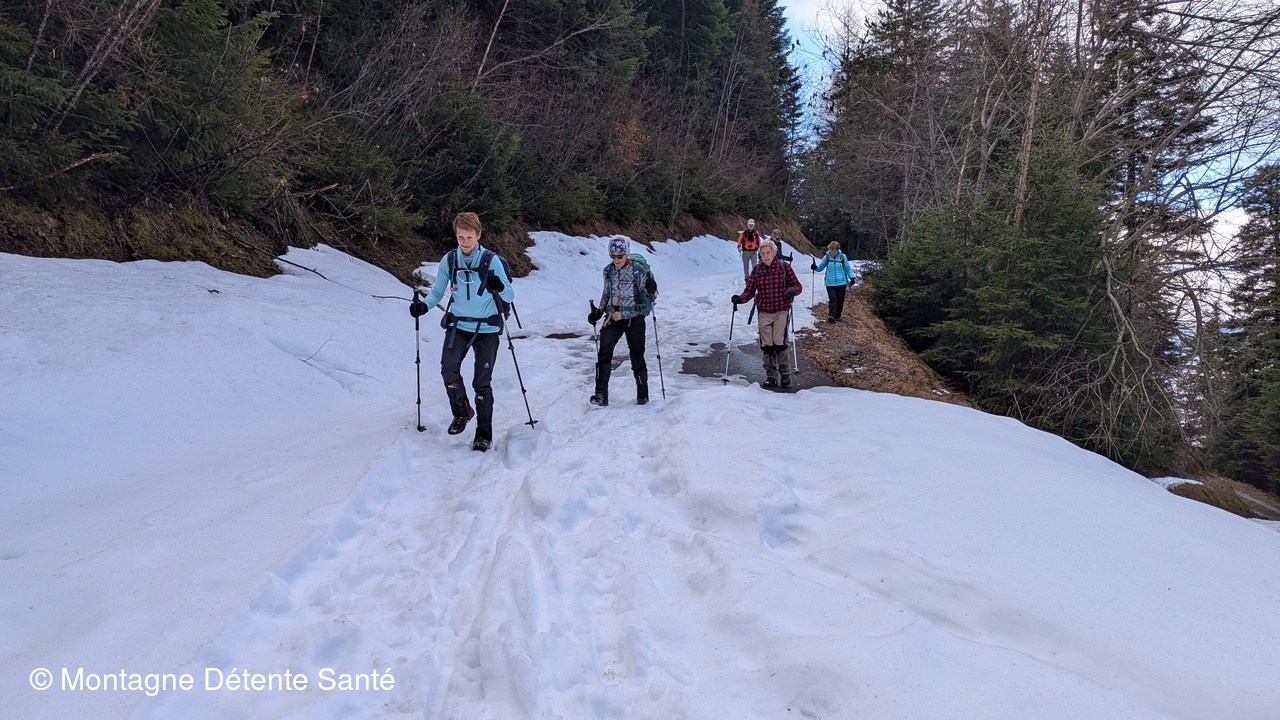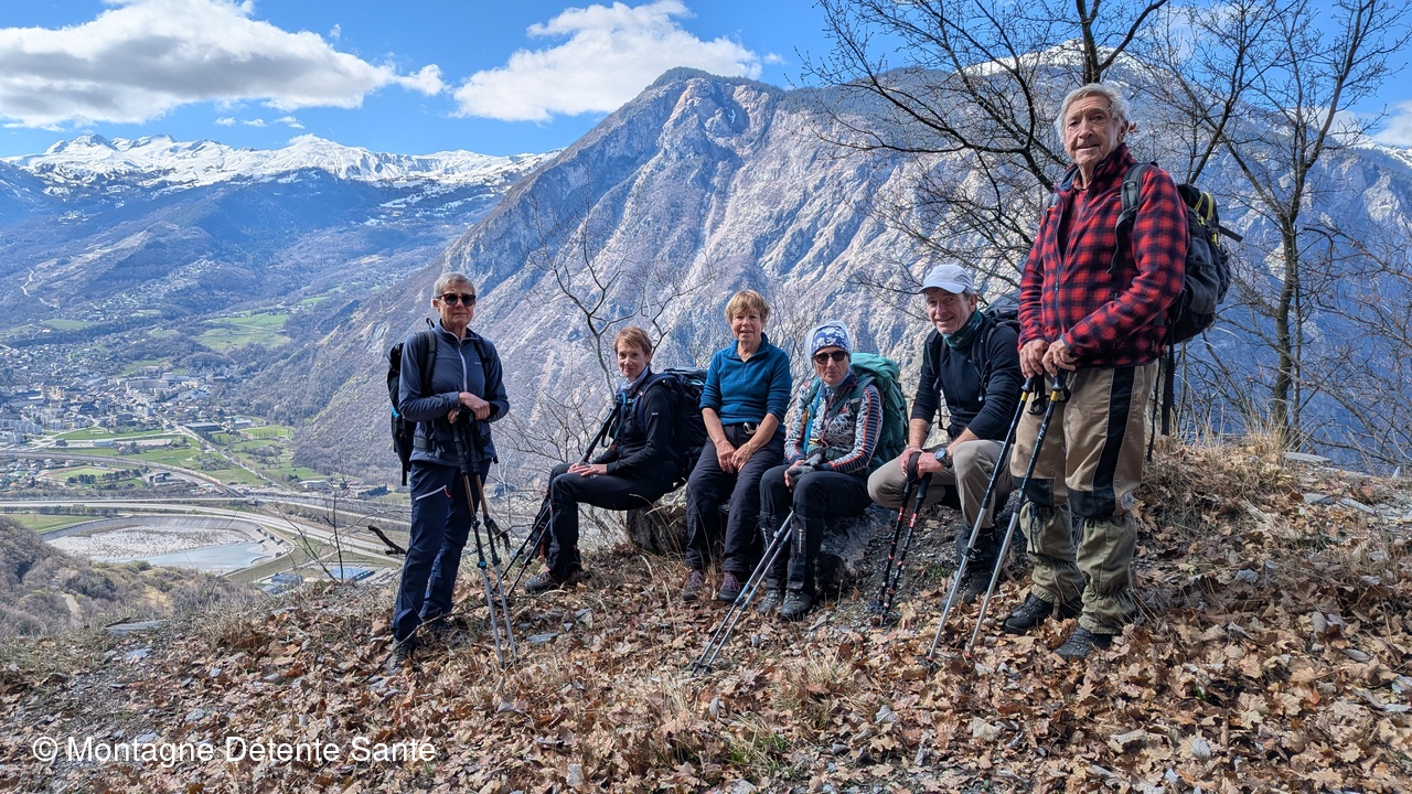 Passé Montandré, l’ascension a repris vers le hameau de Champessuit où nous avons été accueillis par un tout petit chien bien gentil mais un peu bruyant. Après la rapide traversée de ce hameau de trois maisons, le col du Sappey a été rapidement atteint. A cette altitude, la neige était encore bien présente sur la route. La neige, nous l’avons encore croisée, un peu plus bas. Dans une petite Combe, une énorme coulée de neige de plus de deux mètres de hauteur obstruait la piste. Nous avons pu sans difficulté franchir l’obstacle imprévu et rejoindre le hameau des Grangettes, lieu prévu pour le casse-croûte. La collation avalée, la descente vers Hermillon a repris puis, nous avons engagé la dernière petite montée qui nous a ramené à Montandré où nous avons visité le site de la chapelle et admiré trois grands bouquetins particulièrement placides et peu farouches.