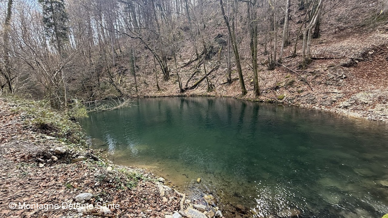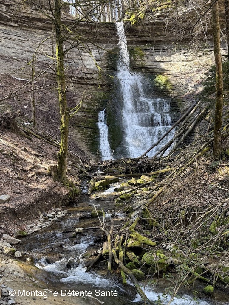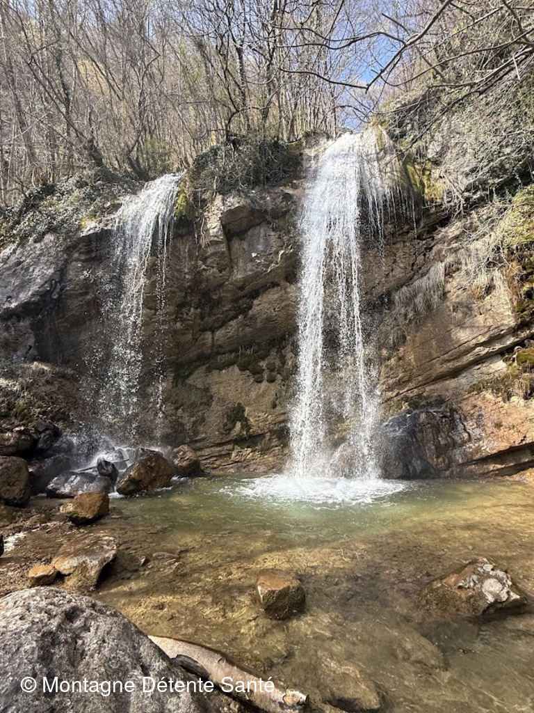 Il faut penser à revenir,... retour via le même sentier balcon jusqu'au belvédère du Puy, nous poursuivons notre descente vers les cascades de Glésy, nous longeons les falaises d'escalade, puis franchissons le seul passage exposé de la journée, les mains courantes nous seront bien utiles et arrivons aux cascades de Glésy. A cette époque de l'année, elles ont un débit élevé, alimentées par la fonte des neiges des hauts plateaux de Chartreuse via le plateau des Petites Roches.