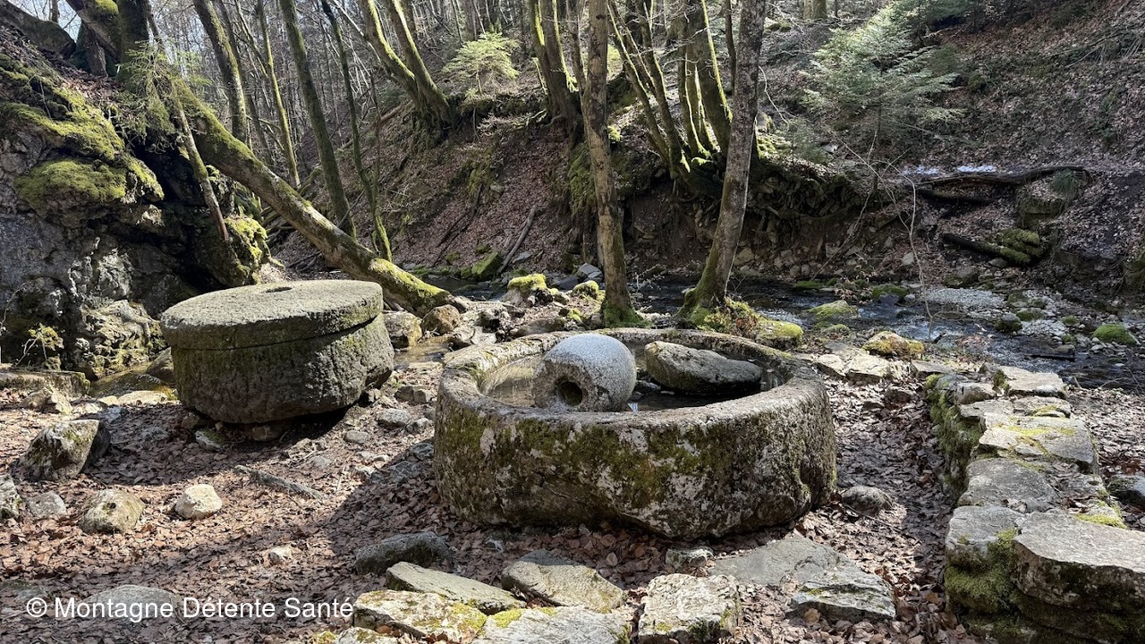 Il est 10 h15, nous avons progressé beaucoup plus rapidement que prévu, à ce rythme là, la voiture sera en vue pour midi. Nous prolongeons donc un peu sur "les pas des Huguenots" en direction de l'ancien moulin de Porte Traine, daté du 13ème siècle dont il ne reste que les ruines. Nous prendrons notre pique-nique en ce lieu, nous continuons vers la cascade des Dioux.
