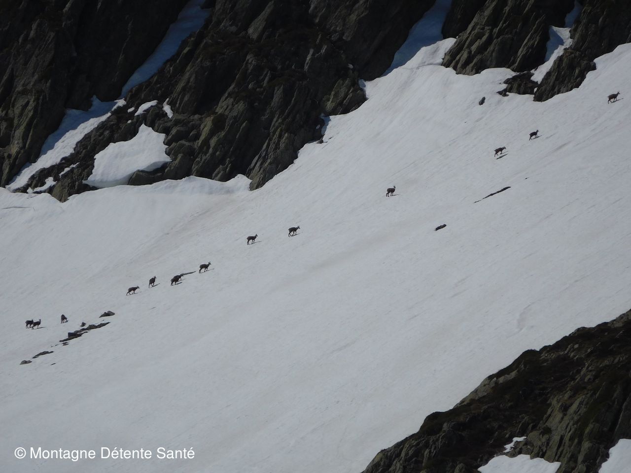 Observation de bouquetins et chamois se coursant dans la neige.